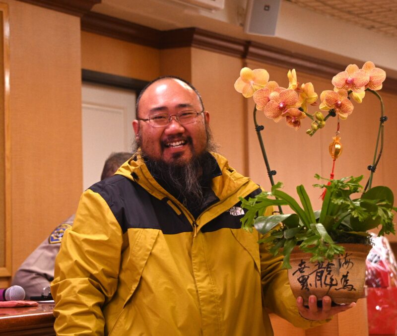 美国城市卫视、美国城市新闻网采访主任冯元兴抽奖捧得兔年兰花
