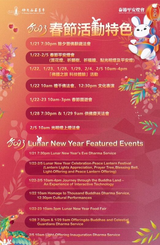 新春系列艺术与文化活动包括:1月21日除夕晚间七点半「辞岁普佛」,以及持续至2月5日平安灯会、初一上午10点新春礼千佛、12点30分新春文化表演、初一及初二园游会活动,以及叩平安钟、点灯祈福及平安香与大家结缘,欢迎大家过年期间到西来寺体验中华文化,品尝年节小吃、观赏精彩的文化表演。
