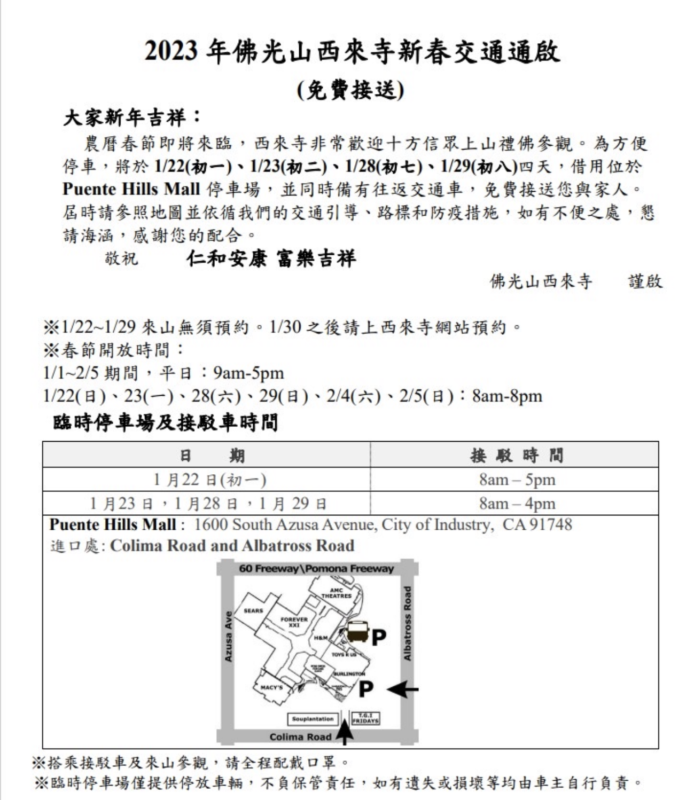 为纾解过年期间来山人潮,西来寺年初一至初八(1月22至29日),入寺不须预约。初一、初二、初七及初八(1月22、23、28、29)两个周末,借用Puente Hills Mall停车场,同时备有往返交通车,免费接送来寺。届时请参照地图及我们的交通路标,遵循警方的指挥。初一、初二、初七、初八、十四、十五(1/22、23、28、29、2/4、2/5)寺院开放时间为上午8点至晚上8点,平日开放时间为上午9点至下午5点,从初九1月30日开始,入寺需要预约。预约网址:佛光山西来寺 佛光山西来寺「重新对外局部开放」相关办法说明 (hsilai.org),感谢大家的配合。