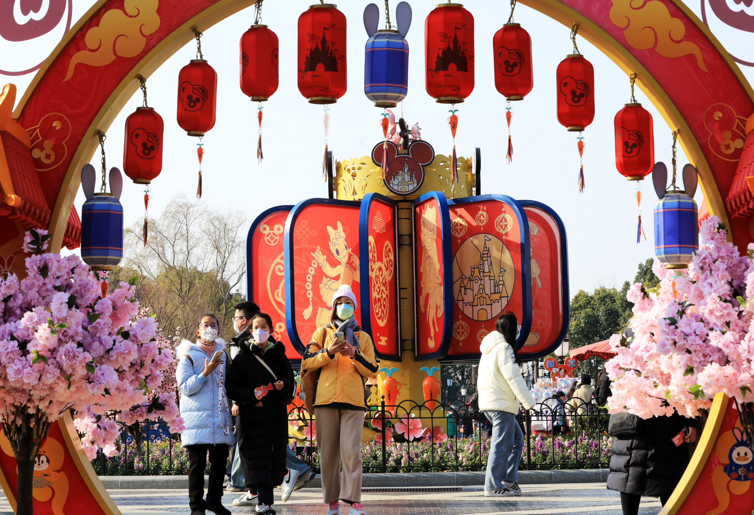 1月17日,游客在上海迪士尼中游玩。农历新年临近,上海迪士尼处处洋溢着迎新的喜庆氛围。正在进行的春节主题庆典吸引了众多游客前来感受年味,体验独具迪士尼特色的奇妙新春。