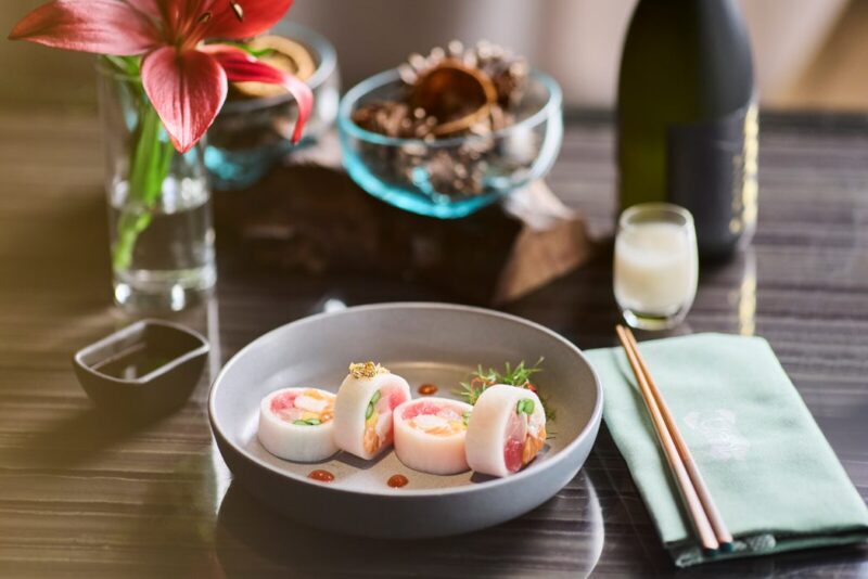 Umi 壽司與蠔吧廚師Kiyo Ikeda在新春期間為食客精心設計的賀年美食,有「金龍獻瑞」龍蝦伊麵 ($128)、「一團和氣」蘿蔔魚生卷($42)、「富貴生財包」鴨鬆生菜包 ($32),三款佳餚都讓人食指大動。