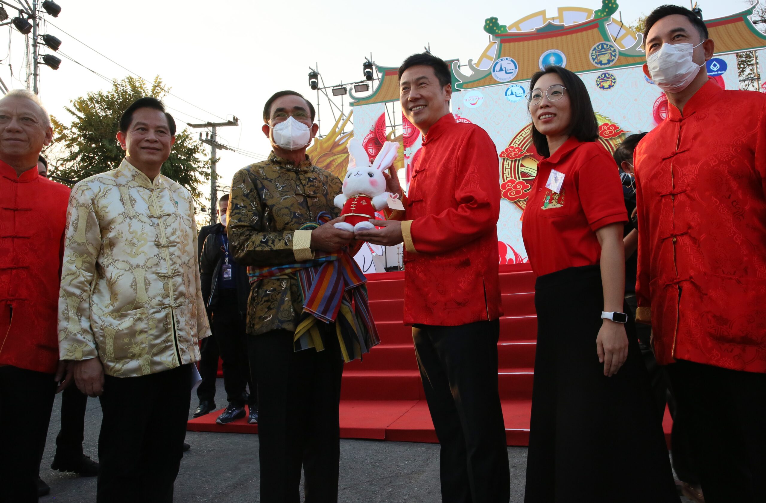 当地时间1月19日,中国驻泰国大使馆临时代办杨欣(右三)向泰国总理巴育(左三)赠送2023“欢乐春节”兔年吉祥物和礼物“红包包”“福袋袋”。当天傍晚,泰国叻丕府春节庆祝会在叻丕府国家博物馆附近举行,巴育和杨欣共同出席开幕式活动。