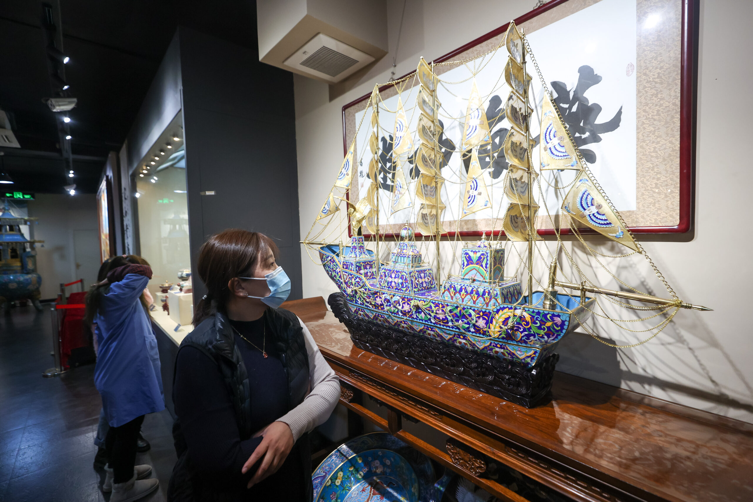 1月19日,《“传承时空,匠心永恒”京珐老艺人、工艺美术大师与当代艺徒传承展》在北京市珐琅厂内的景泰蓝艺术博物馆亮相。展览汇集珐琅厂老艺人、几代工艺美术大师、高级技师在各个时期创作的景泰蓝艺术精品,展现了几代“京珐”人不断创新探索景泰蓝文化艺术的发展历程。图为观众参观展览。