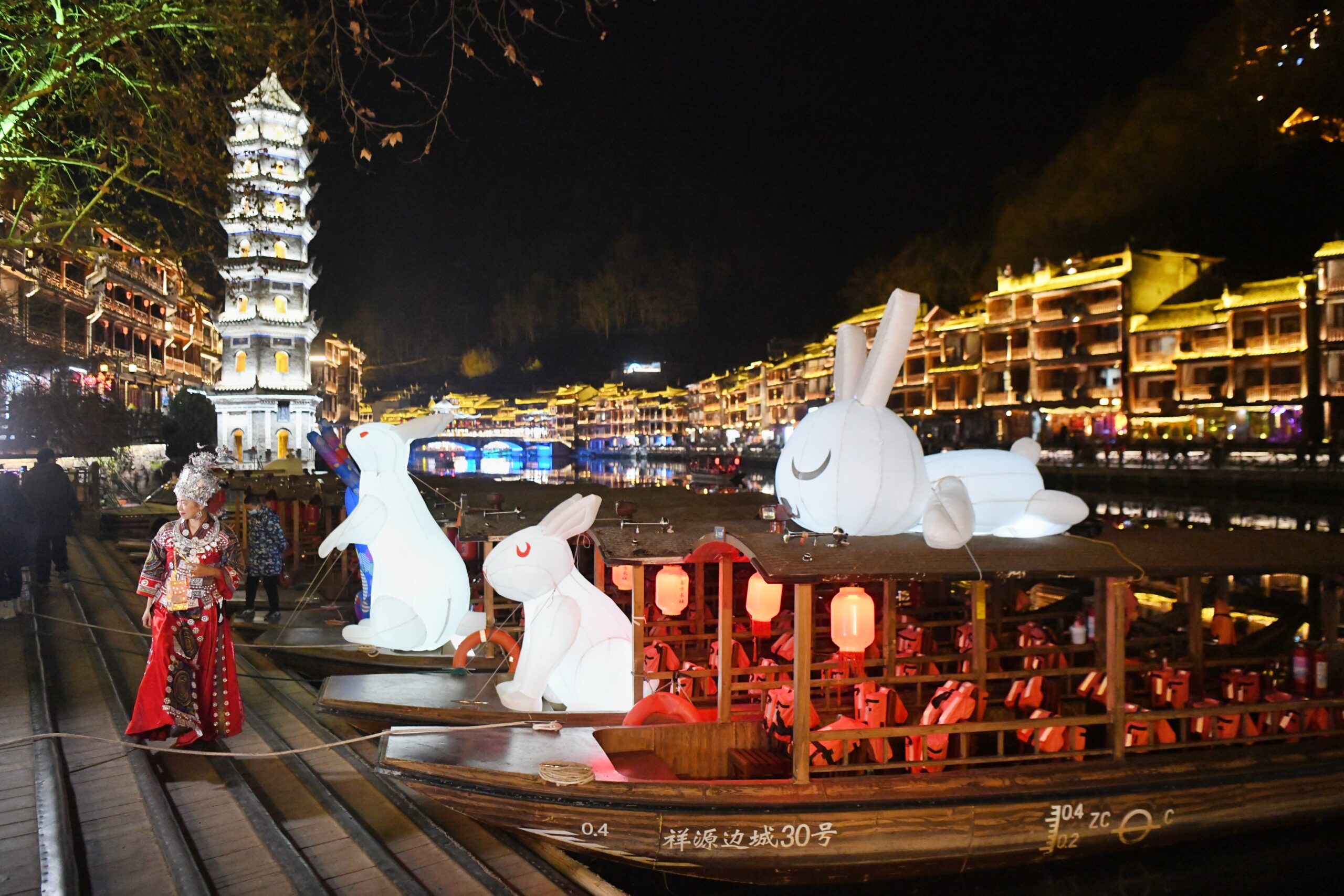 1月20日晚,湖南凤凰古城内的沱江泛舟兔花灯亮灯,游人乘船赏花灯感受年味。图为游人在码头与兔花灯合影。