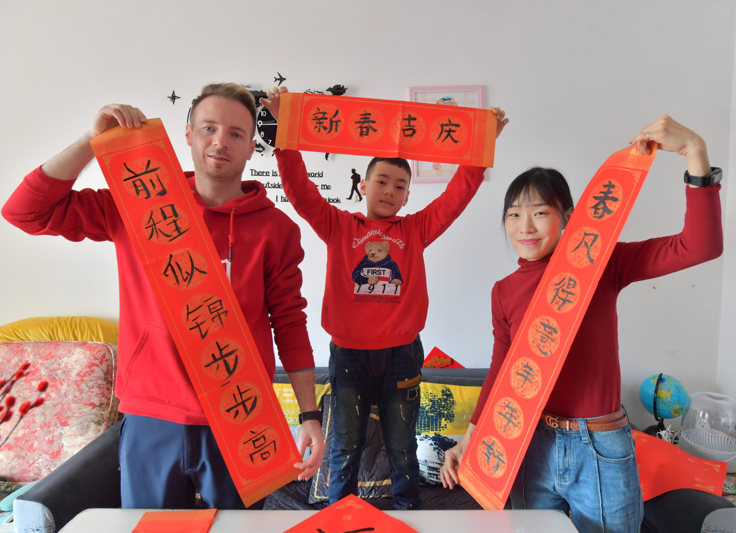 1月20日,在吉林长春,Dali和妻子、儿子在展示他们写的春联。Dali来自北马其顿,他自己取的中文名叫“大礼包”,寓意惊喜、好运。大礼包很喜欢中国,他在中国长春组建了家庭。春节即将到来,他也学着写春联、贴福字、包饺子、打麻将,入乡随俗感受地道“年味”。