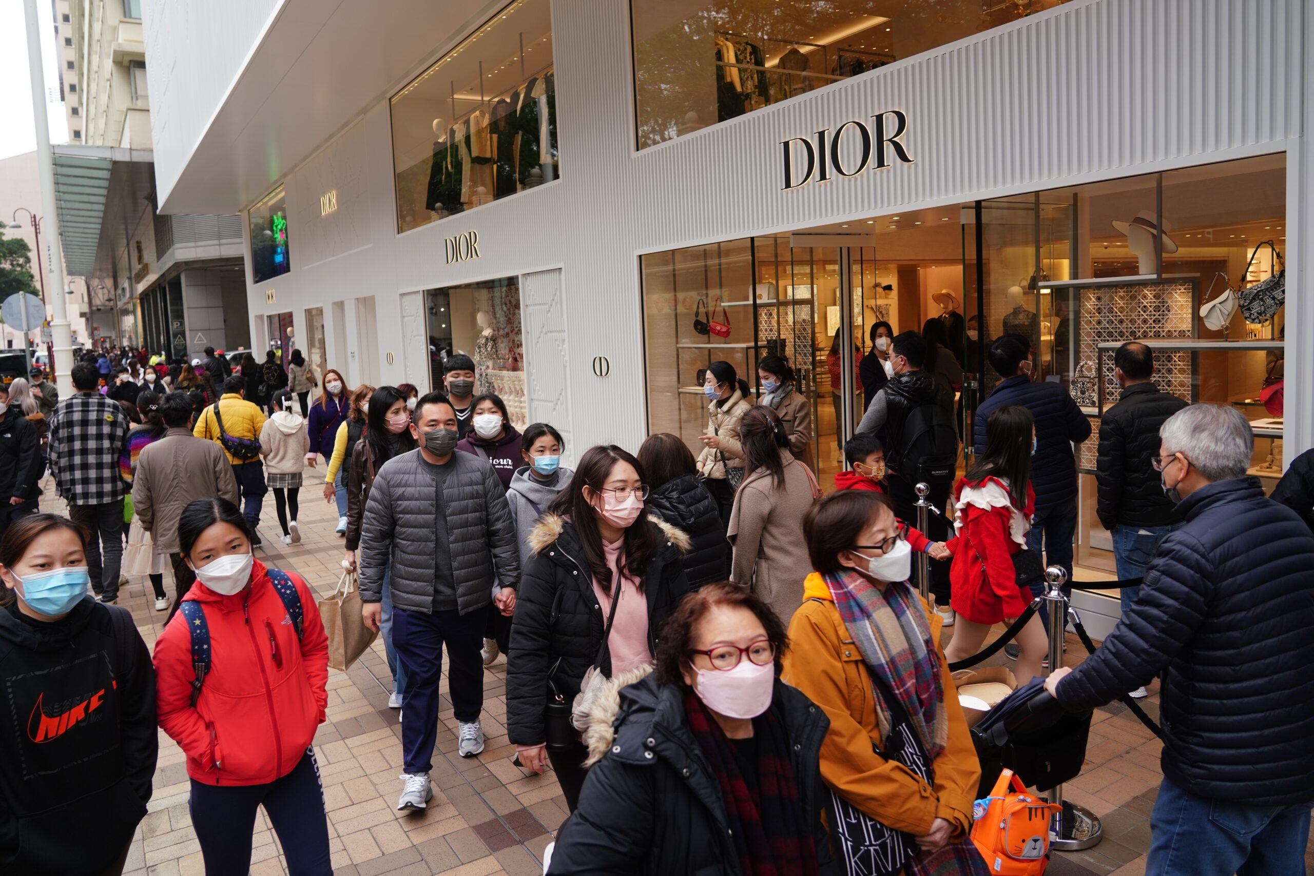 1月25日(农历正月初四),大批内地游客来到香港尖沙咀广东道一带购物,一家奢侈品店门前排起长队。随着香港与内地实现有序“通关”,大批内地游客新春假期来到香港旅游购物。香港入境事务处的数据显示,今年新春初一至初三,共计有41236人次的内地访客入境香港,是去年春节同期的300多倍。