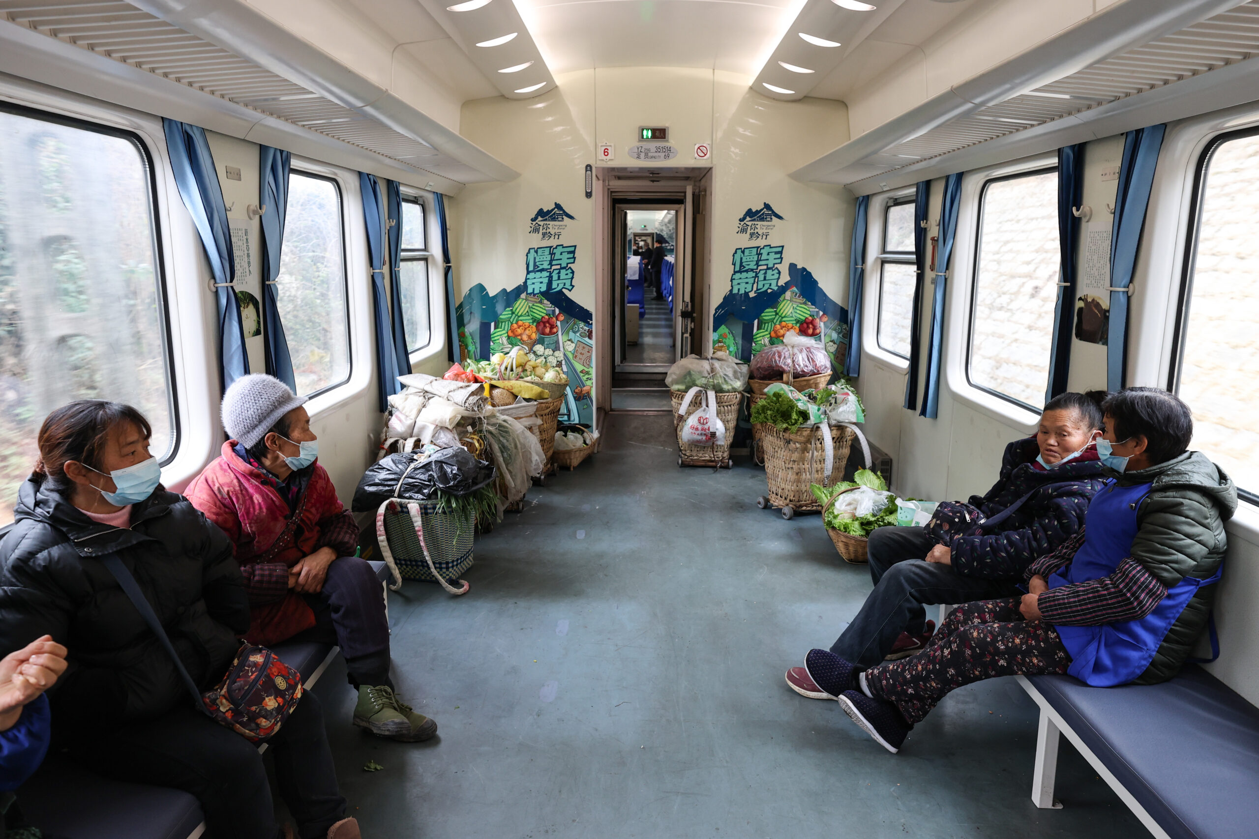 2月3日,贵州汇川,5630次“慢火车”的“带货车厢”。元宵节将至,贵州省遵义市汇川区川黔铁路沿线村民将种植的蔬菜和农特产品通过5630次“慢火车”带到遵义市桐梓县城集市售卖,供应节日市场所需,“慢火车”内设置的“带货车厢”和往常相比更加繁忙。往返于遵义市与重庆市的5629/30次公益性“慢火车”串联着松坝、娄山关等位于山区的站点,目前是川黔铁路仅存的一趟旅客列车,最低票价6元人民币,是当地村民出行的重要交通工具。