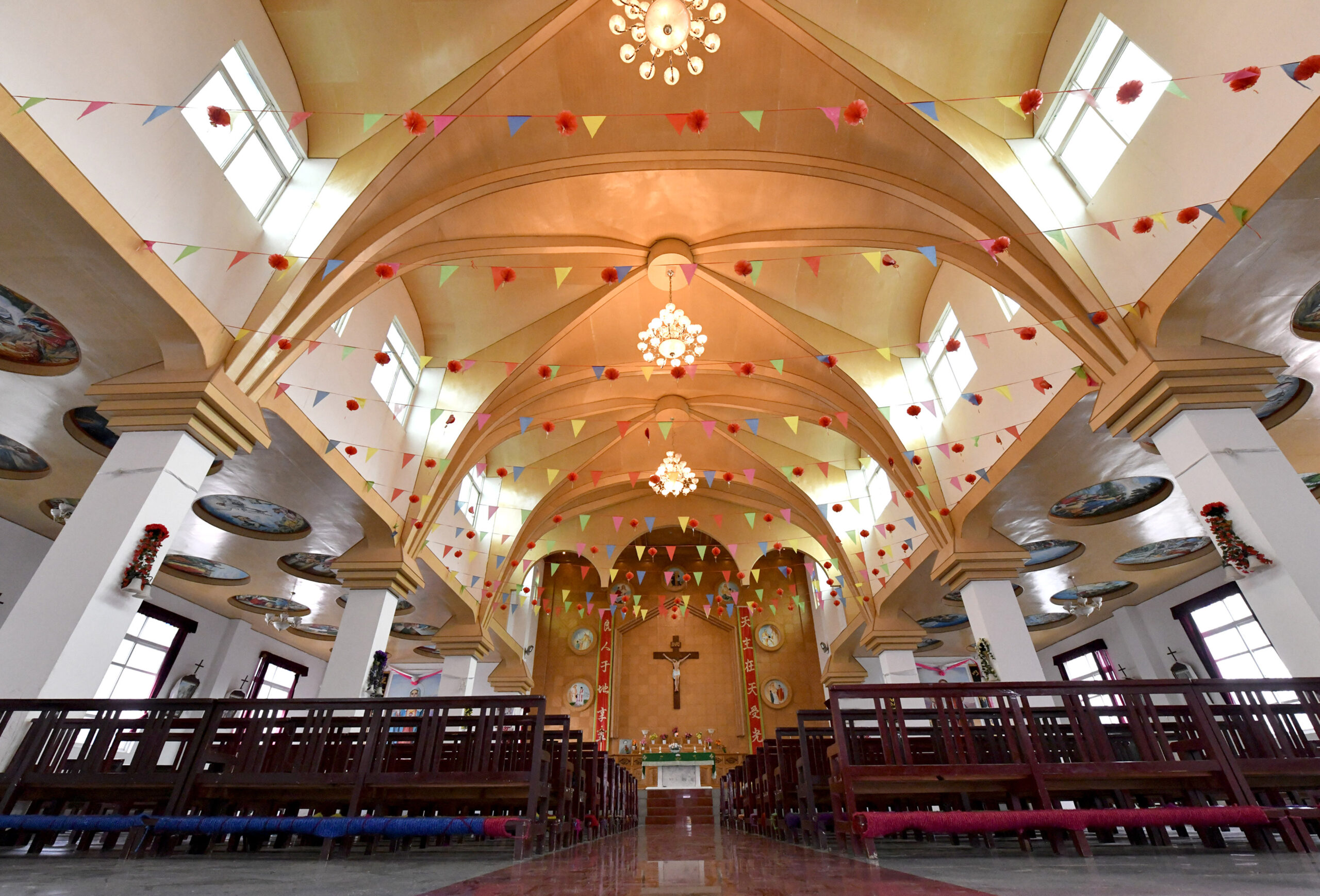 2月13日,盐井天主教堂内部。盐井天主教堂位于国道214线旁的西藏昌都芒康县纳西民族乡上盐井村,由法国传教士建于1865年。从建筑外观看,盐井天主教堂的房檐、廊柱等与藏式民居相似,内部是典型的哥特式风格,东西方文化在此融合。
