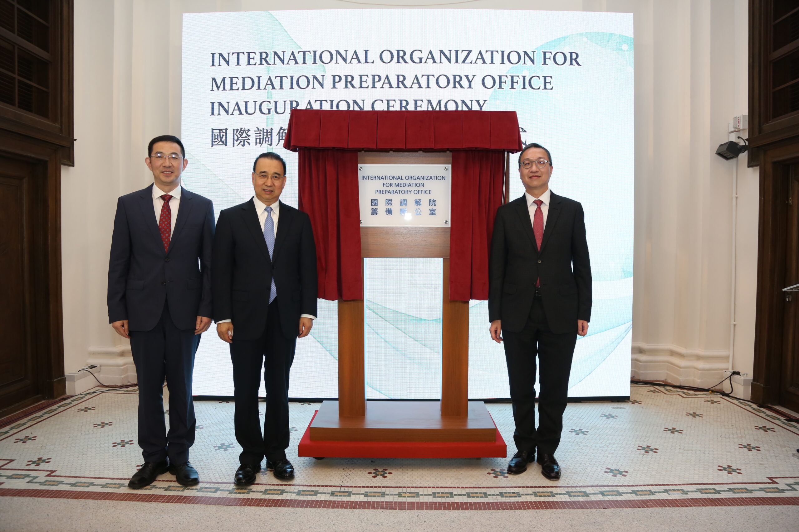 在中央人民政府的支持下,国际调解院筹备办公室的成立仪式2月16日于香港法律枢纽举行。图为外交部驻香港特别行政区特派员公署特派员刘光源(左二)、特区政府律政司司长林定国(右)和国际调解院筹备办公室主任孙劲(左一)主持国际调解院筹备办公室揭牌仪式。
