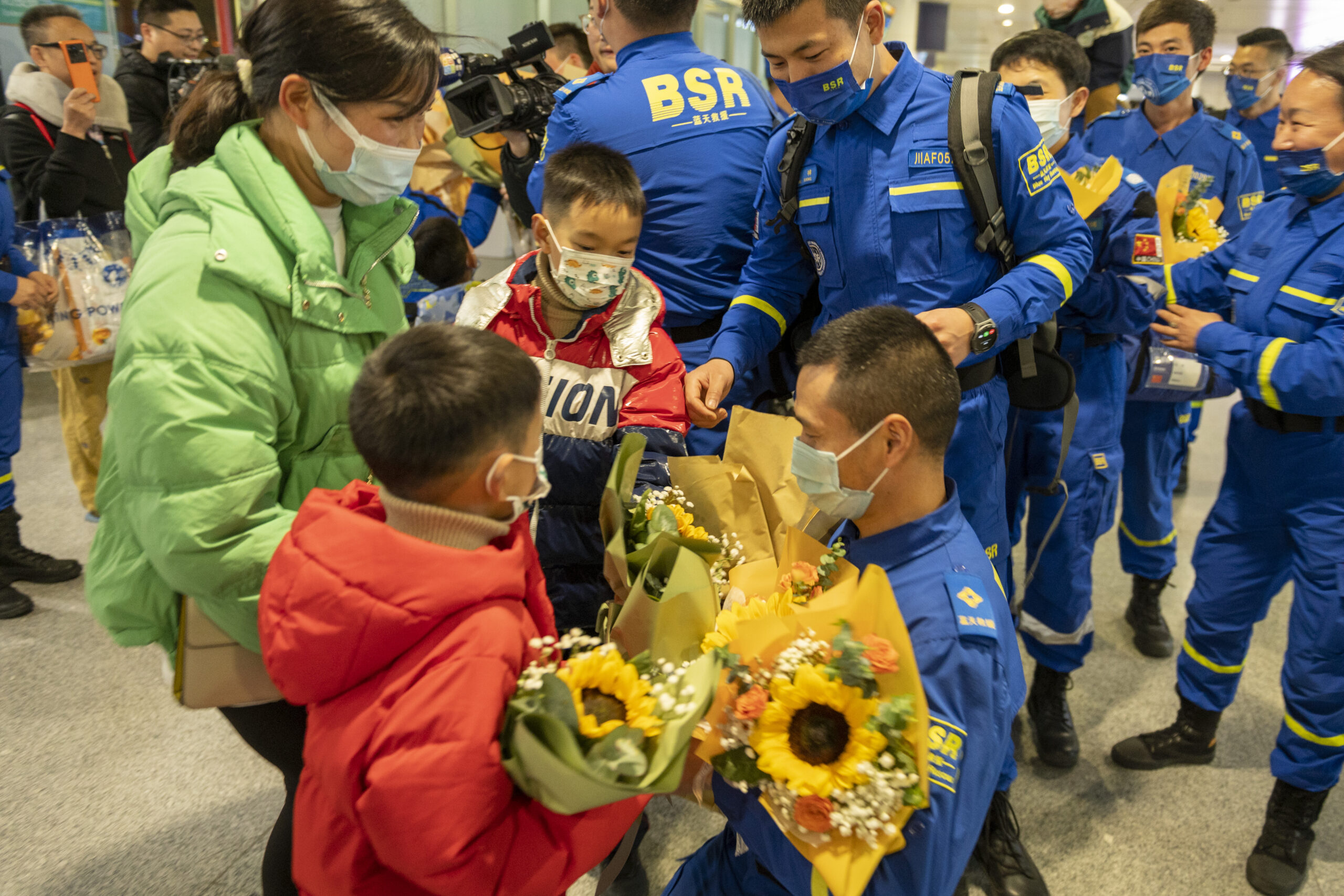 2月21日,参与土耳其地震国际救援的四川蓝天救援队20多名队员先后转机,从泰国曼谷搭乘SL932次航班安全抵达成都双流国际机场。2月6日,土耳其连续发生两次7.8级地震,造成重大人员伤亡和财产损失,中国蓝天救援队300余名队员前往土耳其开展地震国际救援。图为孩子们给参与土耳其地震国际救援归来的队员送上鲜花。