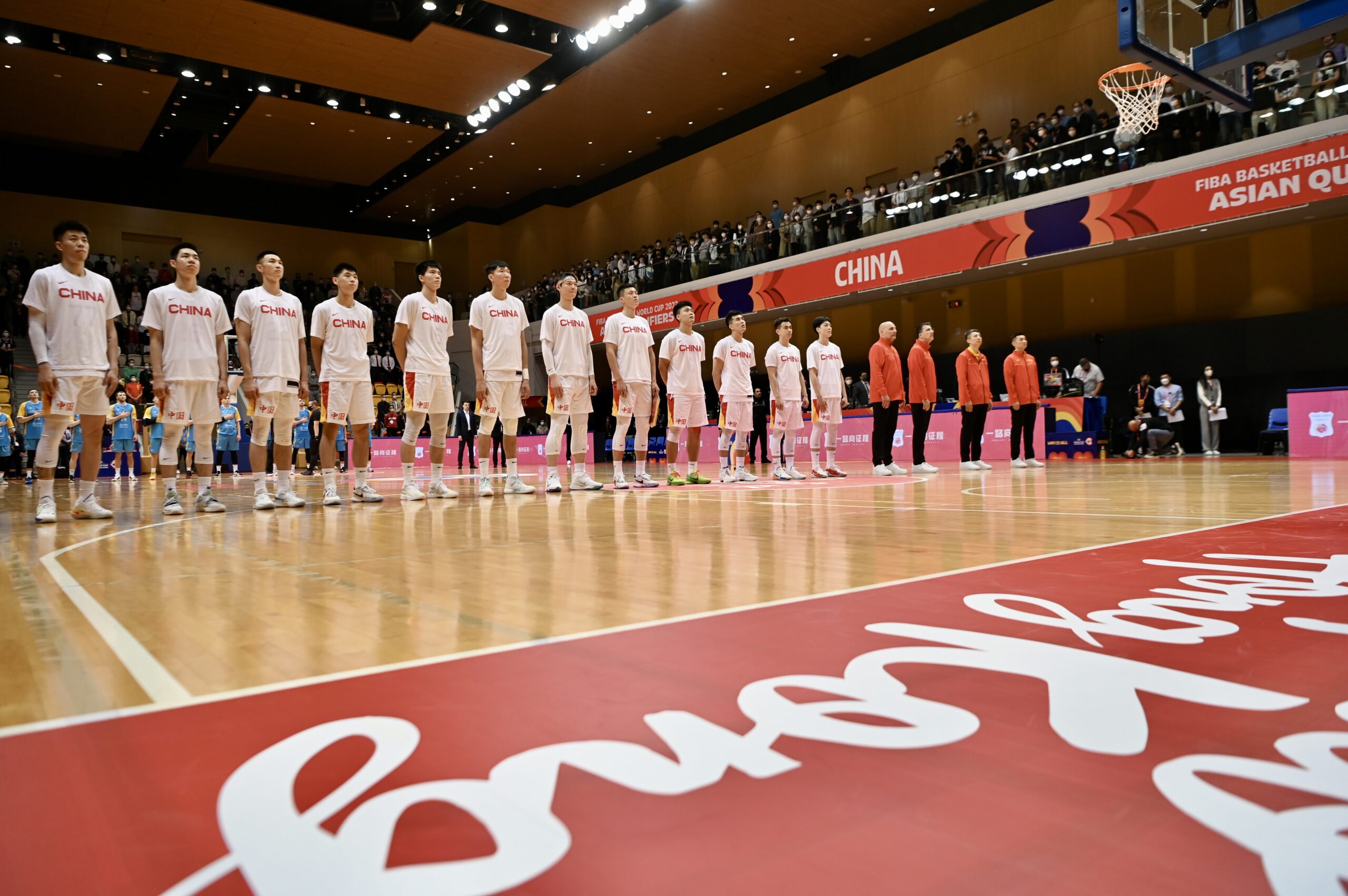 2月23日晚,2023年男篮世界杯亚大区预选赛中国国家男子篮球队对阵哈萨克斯坦队。比赛在香港荃湾体育馆举行,吸引大批球迷入场观看。最终中国队以71:59胜哈萨克斯坦队。图为中国队球员场内肃立奏唱国歌。