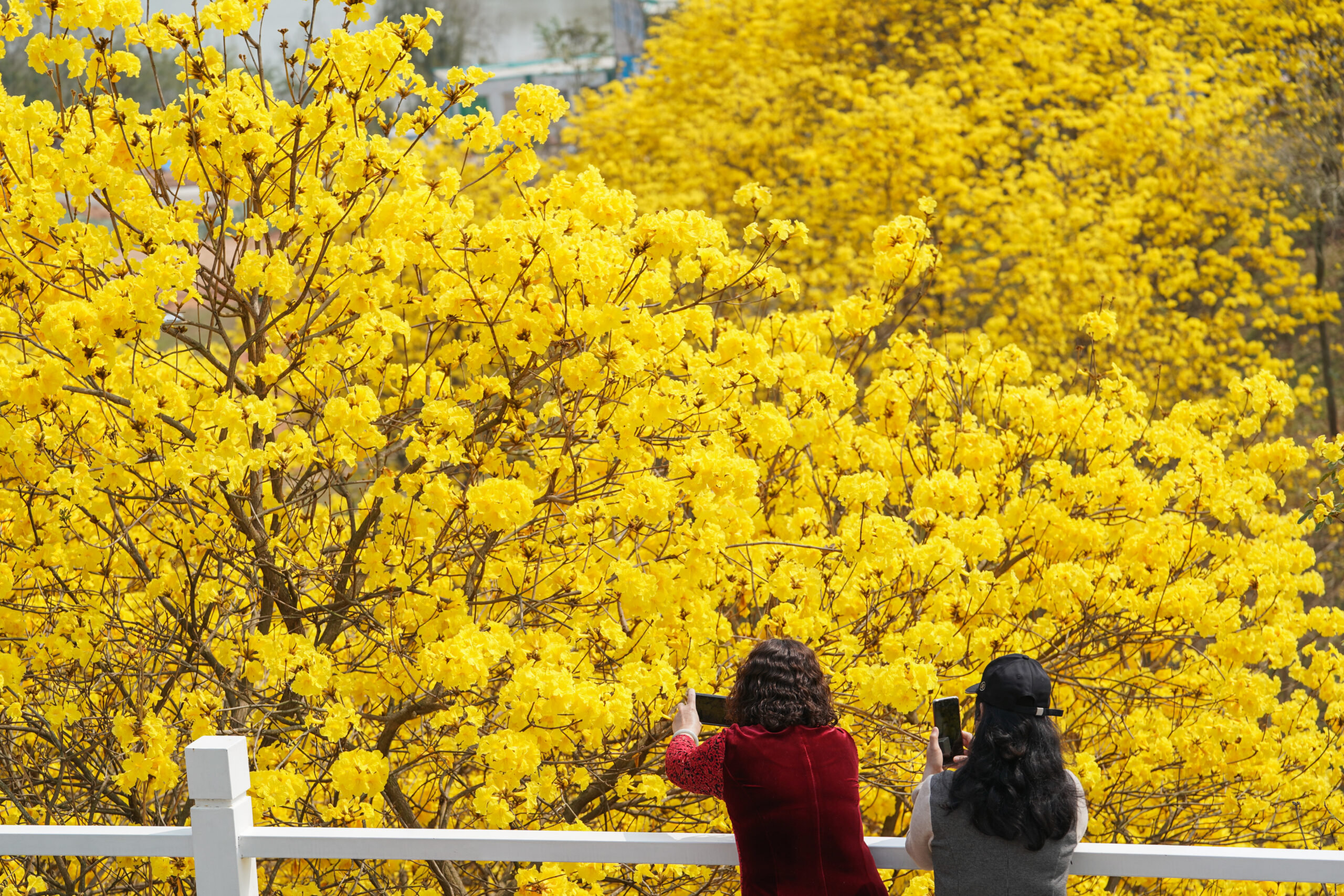 2月27日,广西南宁,游客在位于青秀山风景区的风铃谷拍照。该区域种植的5000多株黄花风铃木近日进入盛花期,吸引大批游客前来赏花、游玩。 未经允许不得转载:城市新闻网icitynews » 广西南宁:山谷黄花开 游客拍照忙