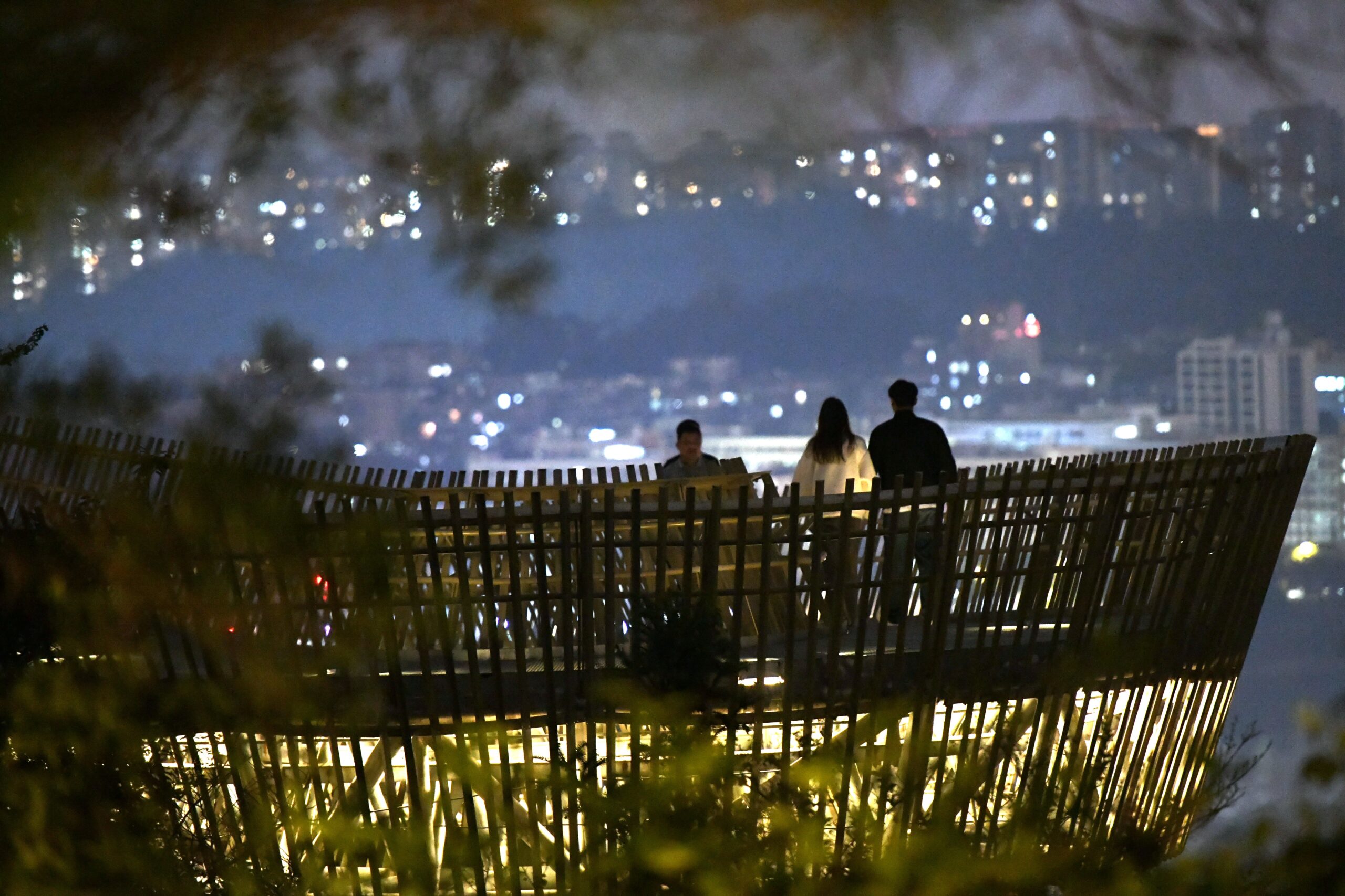 3月1日晚,福建福州,民众夜游“福道”。“福道”紧邻福州城区,是福州市首条城市山水生态休闲健身走廊。