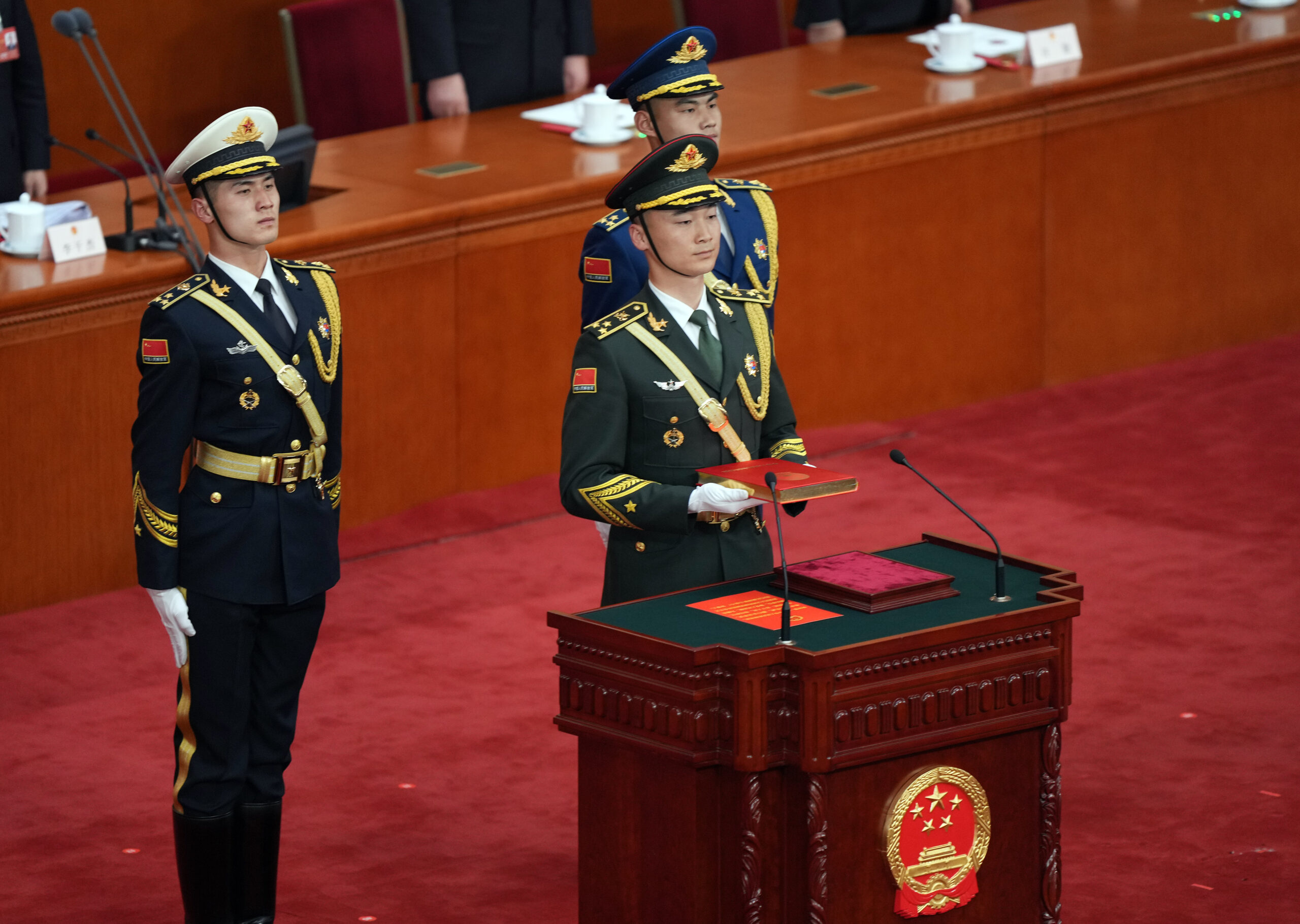 3月10日,十四届全国人大一次会议宪法宣誓仪式在北京人民大会堂举行。主席台上,3名礼兵护送《中华人民共和国宪法》入场。 未经允许不得转载:城市新闻网icitynews » 十四届全国人大一次会议宪法宣誓仪式举行