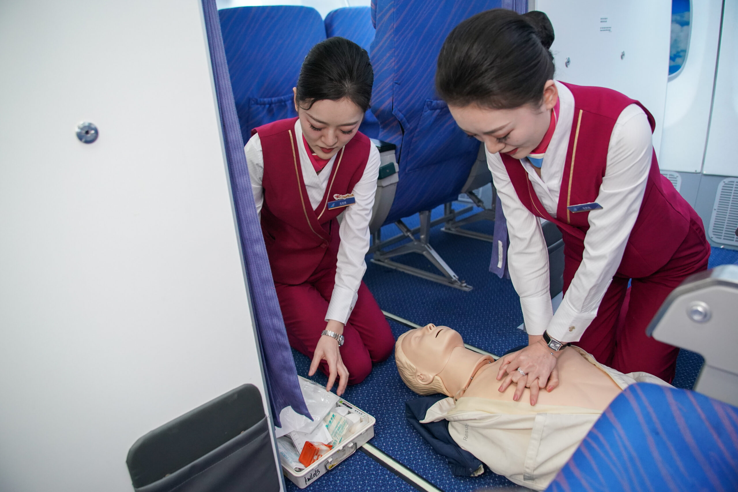 3月14日,广西南宁,中国南方航空广西分公司客舱部双胞胎乘务员姜赛楠(右)与姜超楠(左)在模拟舱进行例行心肺复苏术训练。这对来自哈尔滨的“90后”空姐已有7年工作经验。在飞机上,她们除了担任乘务员,还有消防员、护士、知心大姐姐(心理辅导师)等多重身份。