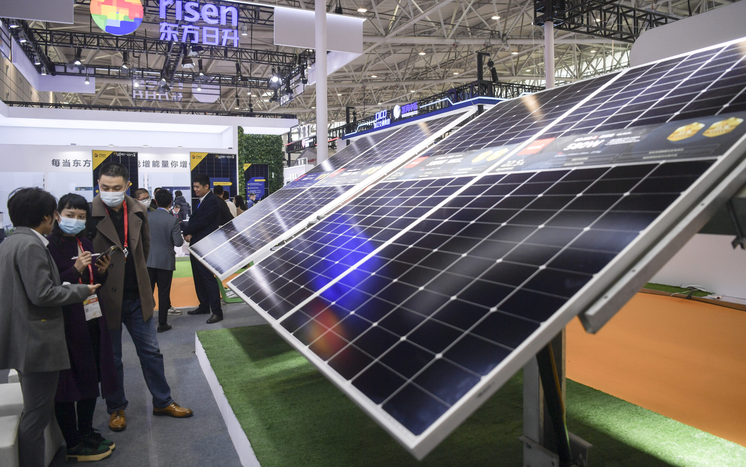 3月20日,参观者在展会上参观咨询。当日,第18届中国(济南)国际太阳能利用大会暨第二届中国(山东)新能源产业博览会在济南的山东国际会展中心开幕。本届展会以“金色阳光,清洁能源,双碳引领,绿色发展”为主题。
