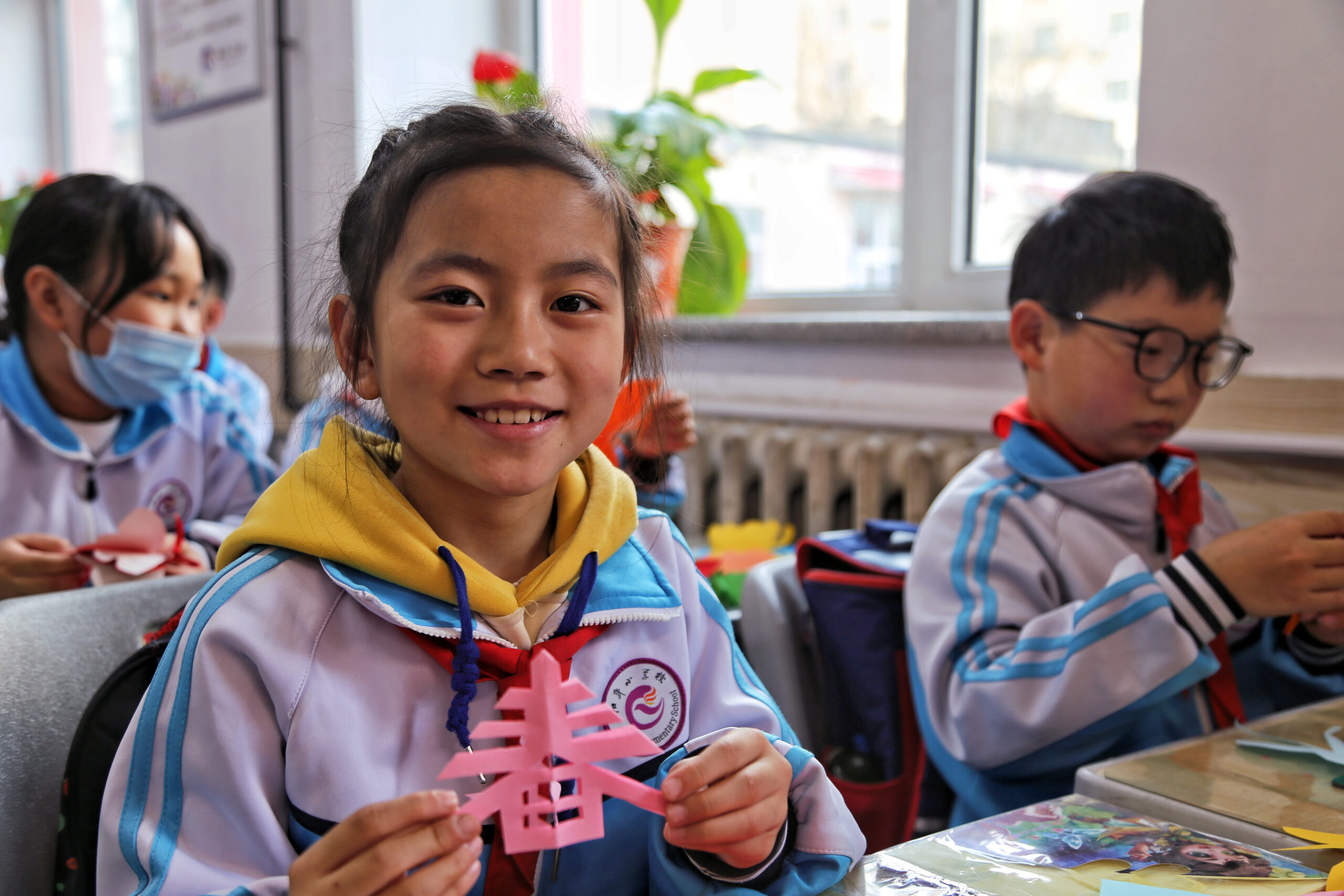 3月21日,在哈尔滨市和平小学校,学生们展示剪好的“春”。当日,黑龙江省非物质文化遗产传承人施丽华将剪纸技艺带入校园,使学生们在春分时节,体验剪出蝴蝶、“春”字等带有春季元素的剪纸。