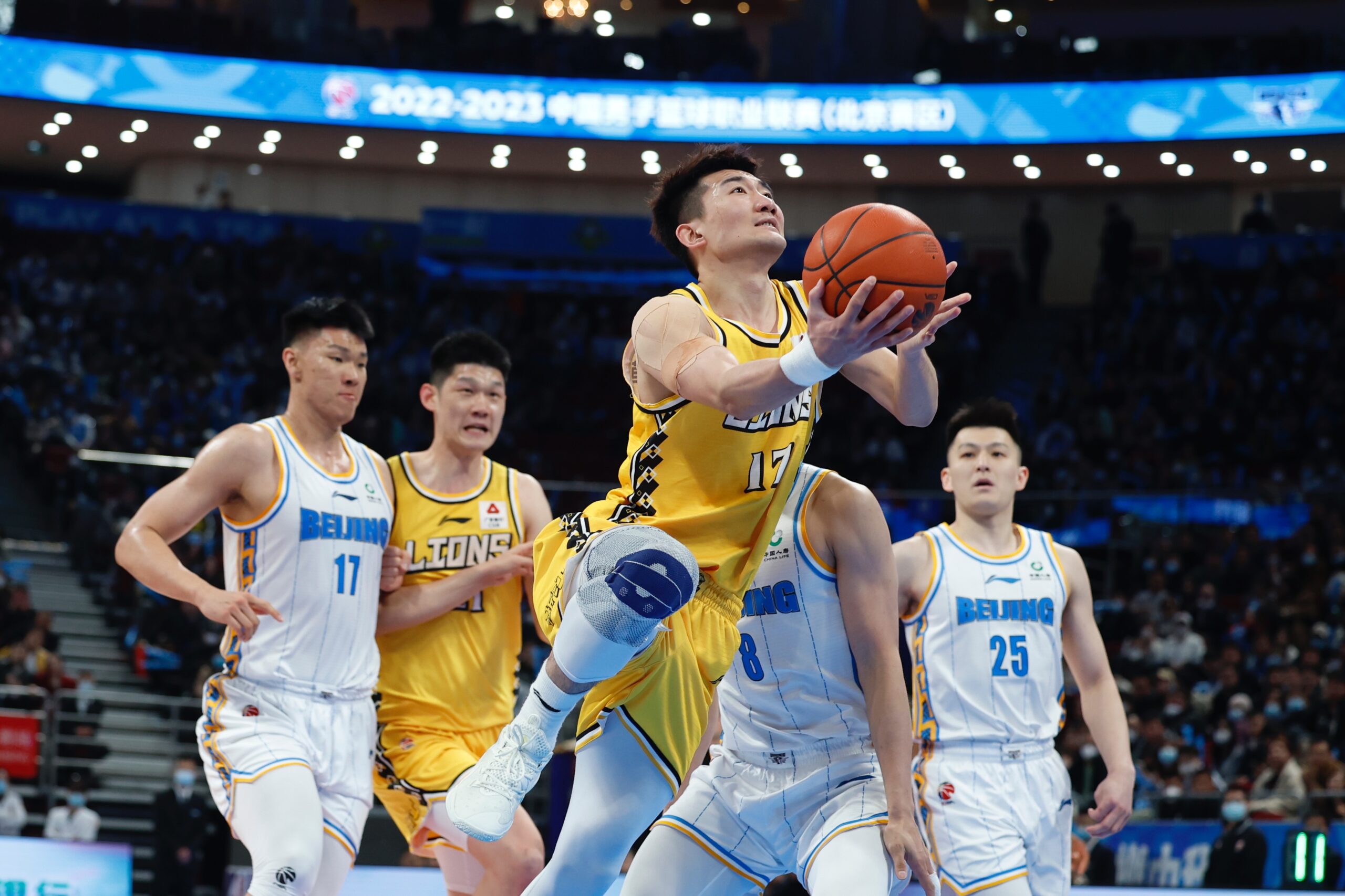 3月22日,浙江东阳光队孙铭徽(黄衣,17号)在比赛中上篮。当日,在北京进行的2022-2023赛季中国男子篮球职业联赛(CBA)常规赛第38轮比赛中,北京首钢队主场以92:108负于浙江东阳光队。