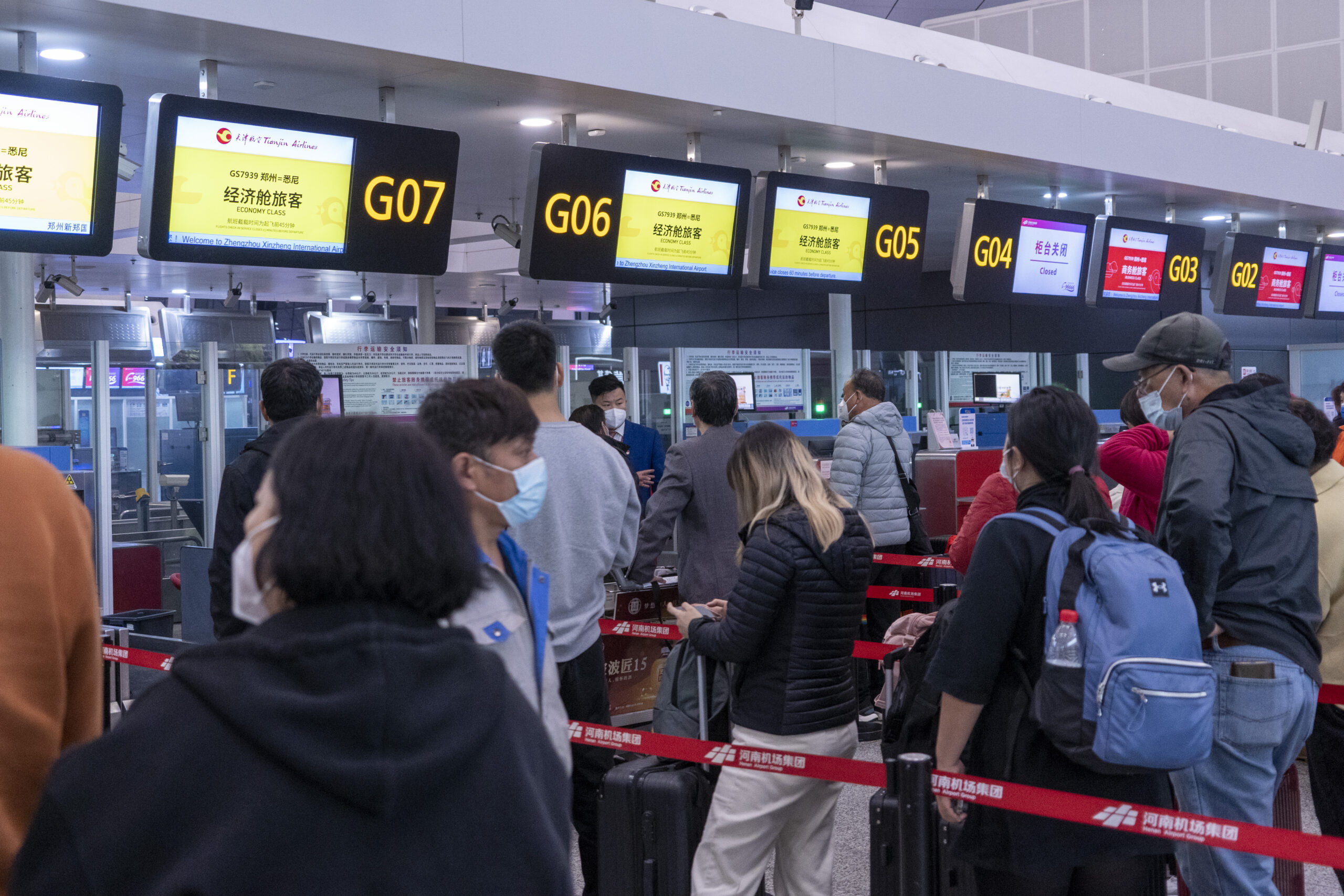 3月24日,天津航空联合河南机场集团,在河南郑州举行天津至郑州至悉尼洲际客运航线启航仪式,首批百名旅客乘坐A330大型客机从郑州直飞悉尼,见证了郑州新郑国际机场今年复航开通的首条洲际定期航线的开通。据介绍,自2018年1月起,天津航空首次开通天津至郑州至悉尼客运航线,在运营的两年时间里,共执行138个往返航班。复航后计划每周一班。图为前往悉尼的旅客在郑州新郑国际机场等待办理值机。