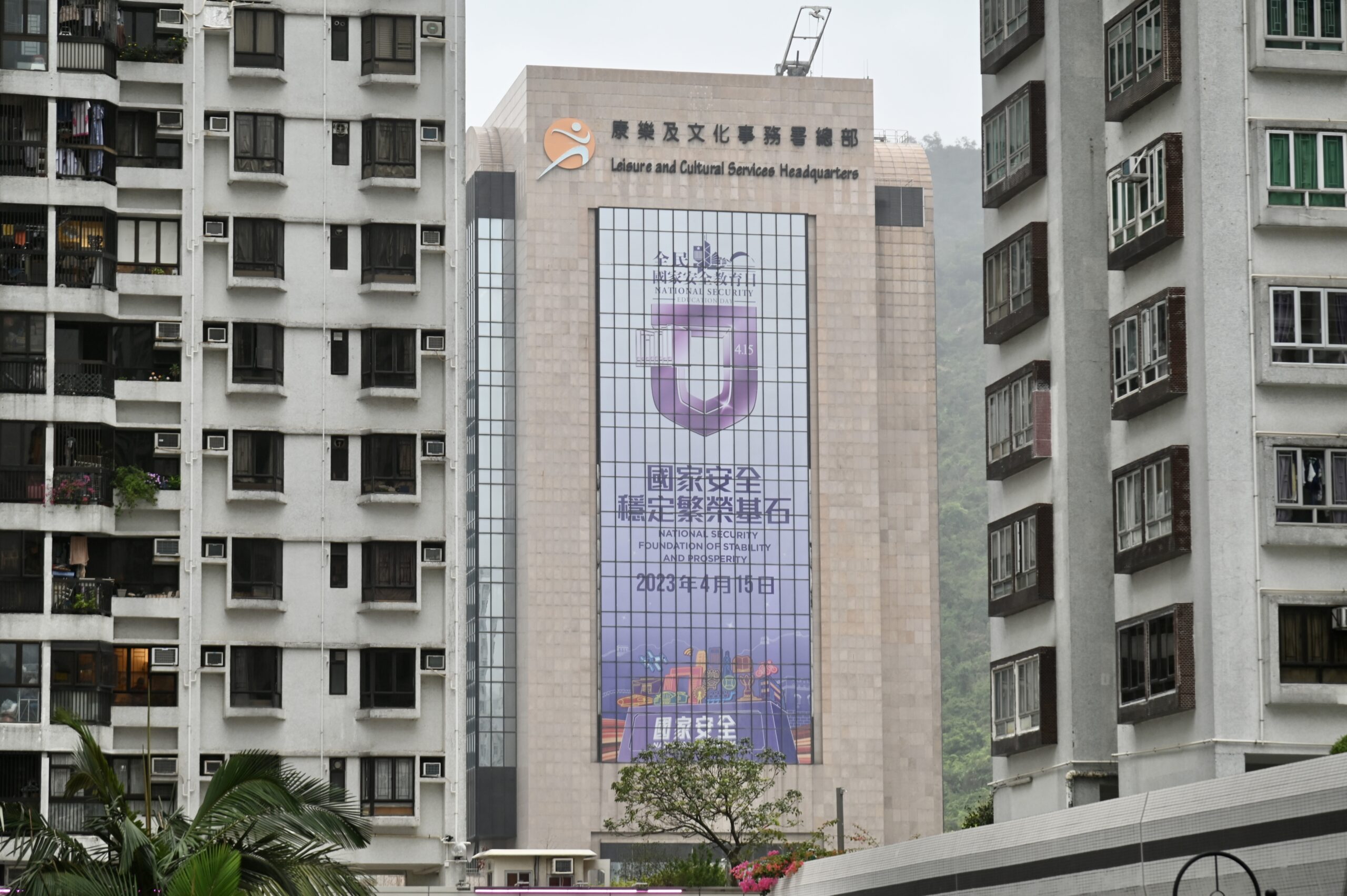 3月27日,香港特区政府康乐及文化事务署总部的外墙贴有全民国家安全教育日的巨幅海报,海报内写有“国家安全 稳定繁荣基石”,为4月15日的全民国家安全教育日作宣传。