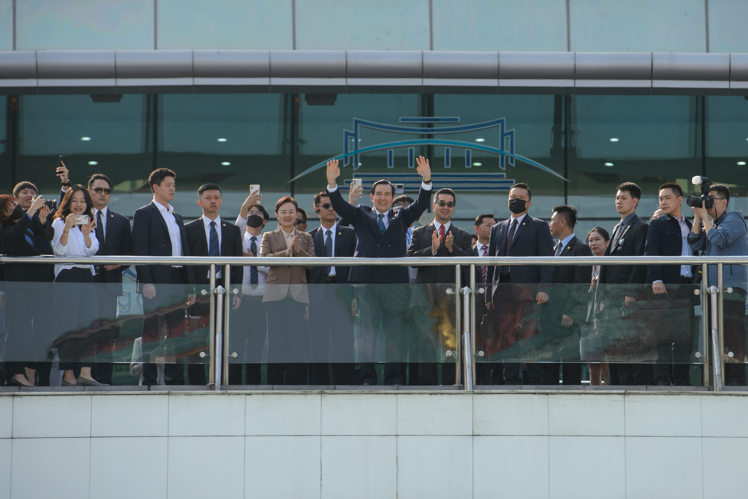 4月3日下午,马英九一行来到位于重庆渝中区的重庆中国三峡博物馆参访。重庆中国三峡博物馆是一座集巴渝文化、三峡文化、抗战文化、移民文化和城市文化等为特色的历史艺术类综合性博物馆,前身为1951年成立的西南博物院。图为参访结束后,马英九向重庆市民热情挥手。