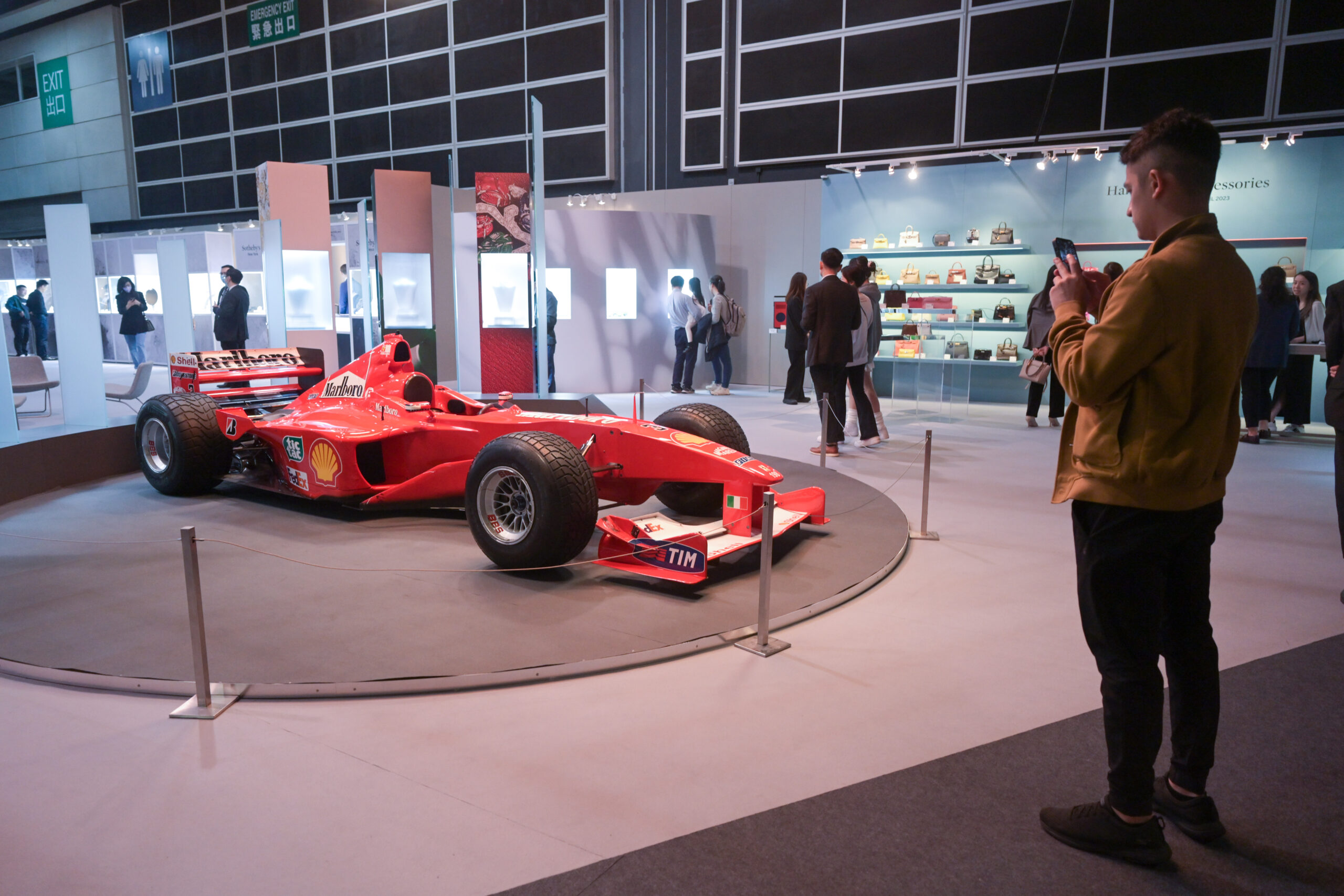 4月3日,苏富比香港春季拍卖预展正在香港会议展览中心举行,吸引参观者预约到场观赏展品。图为迈克尔·舒马赫曾驾驶过的2000年法拉利F1-2000赛车亮相苏富比香港春季拍卖预展。