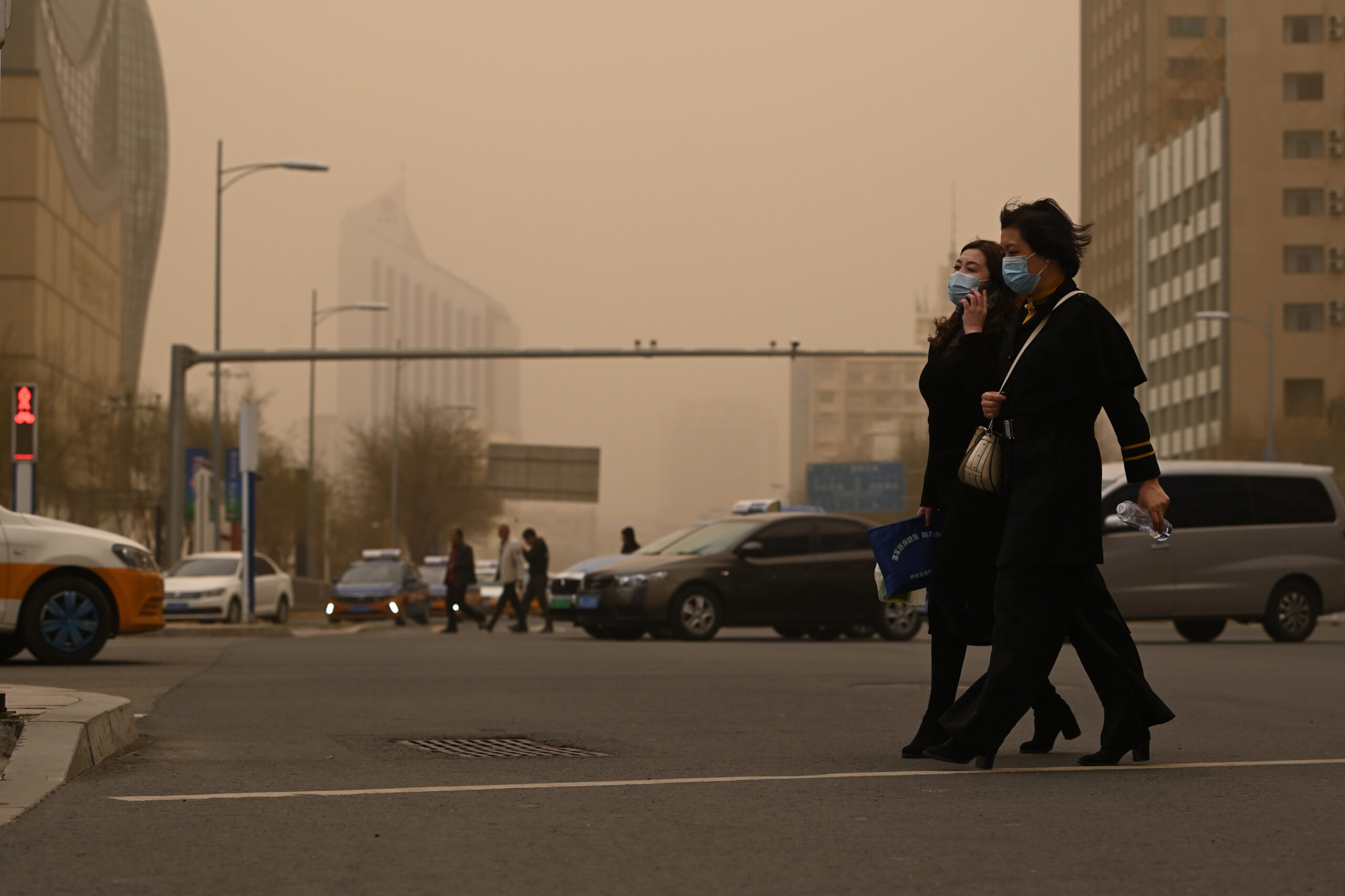 4月10日,内蒙古呼和浩特市出现大风沙尘天气,市民在风沙中出行。