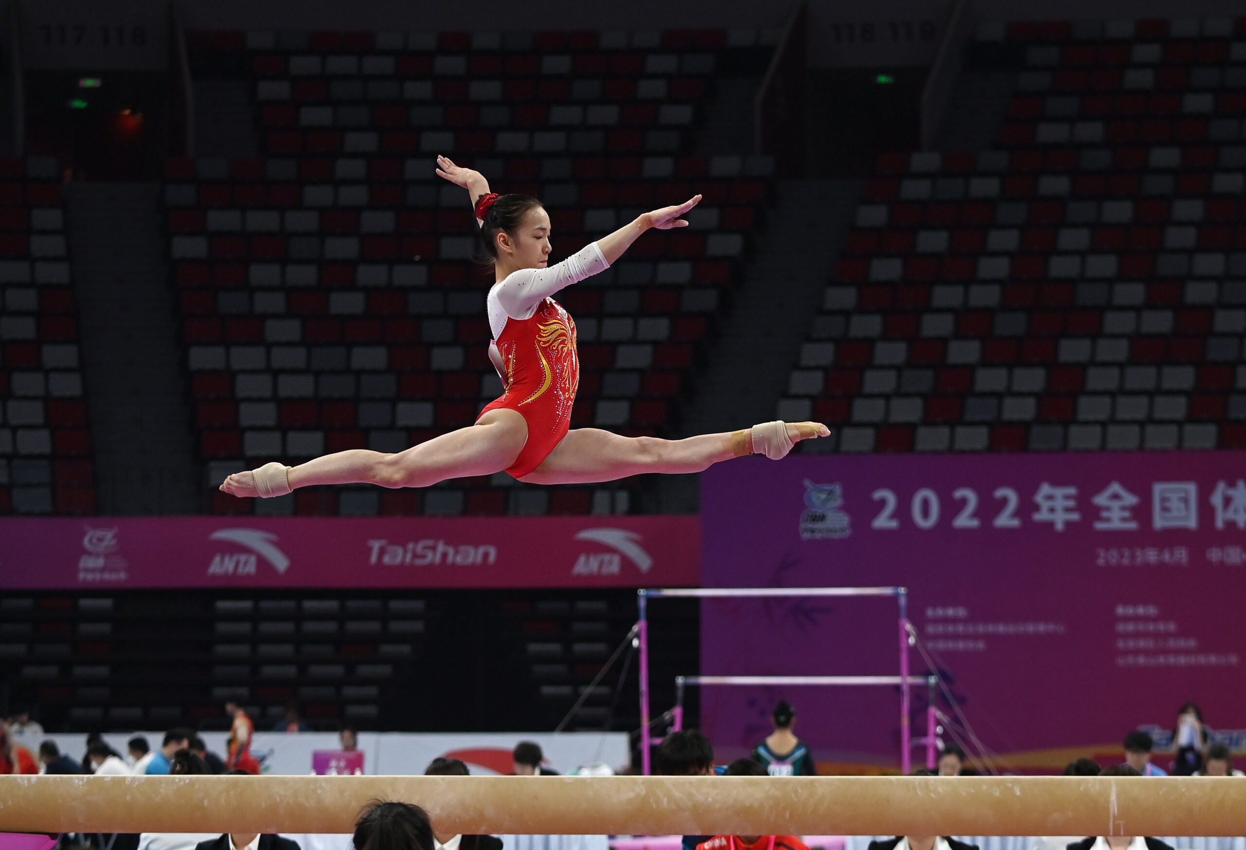 4月11日,2022年全国体操冠军赛在成都开赛。图为运动员在平衡木比赛中。