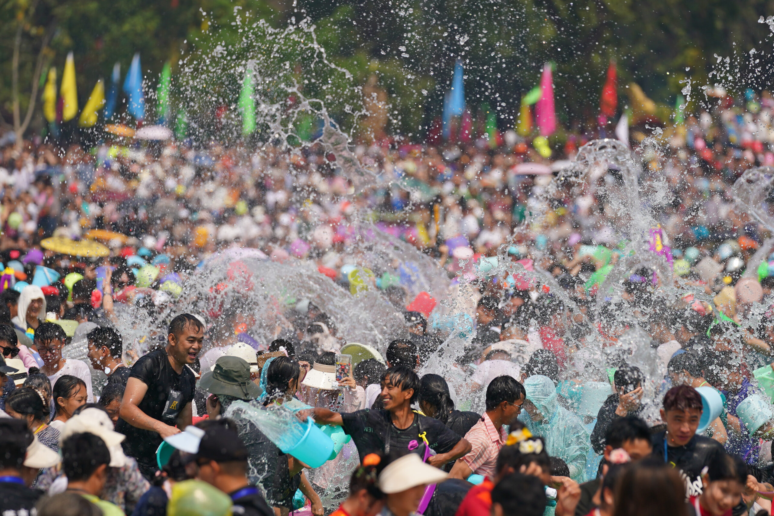 4月12日,云南省德宏傣族景颇族自治州芒市的泼水节正式启幕,游客和当地民众一起泼水狂欢。