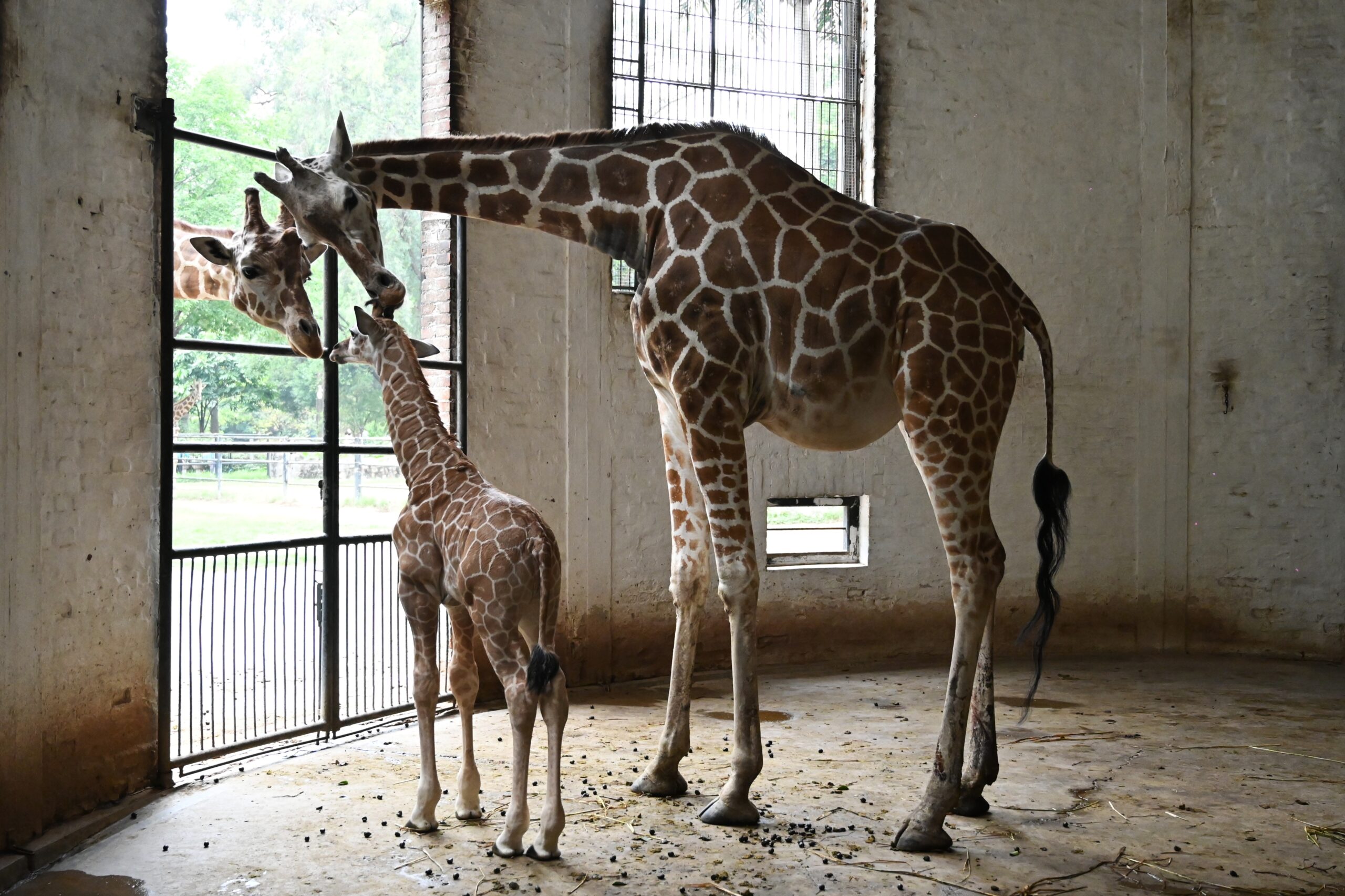 4月14日,广州动物园一只新生的长颈鹿宝宝迎来“满周”。据园方介绍,作为长颈鹿爸爸“海八五”和长颈鹿妈妈“海华”的爱情结晶,这只长颈鹿宝宝于4月7日出生,出生身高达1.9米。图为长颈鹿宝宝和长颈鹿爸爸“海八五”(左)、长颈鹿妈妈“海华”亲密互动。