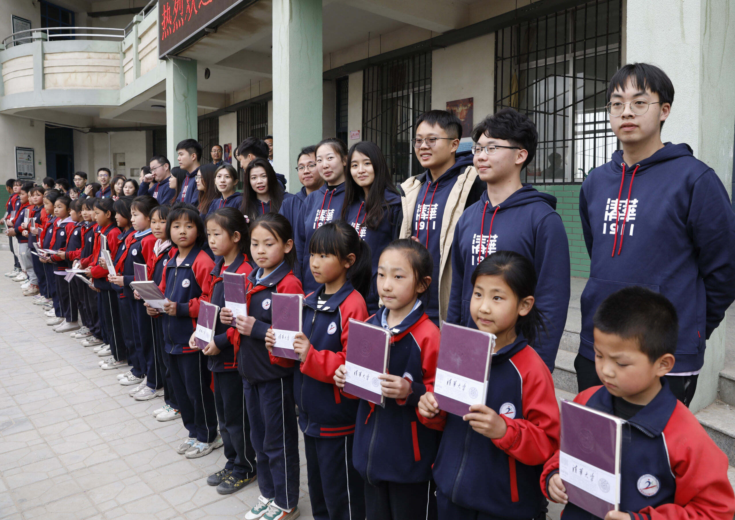 4月20日,“清华学子赴西北,筑梦乡村孩童展未来”活动在宁夏银川举行,20余名清华大学学子走进宁夏银川市西夏区兴泾镇第二小学,以“梦想”为主题,为乡村儿童上了一堂别样的分享课。图为清华大学学生为小朋友赠送纪念品。
