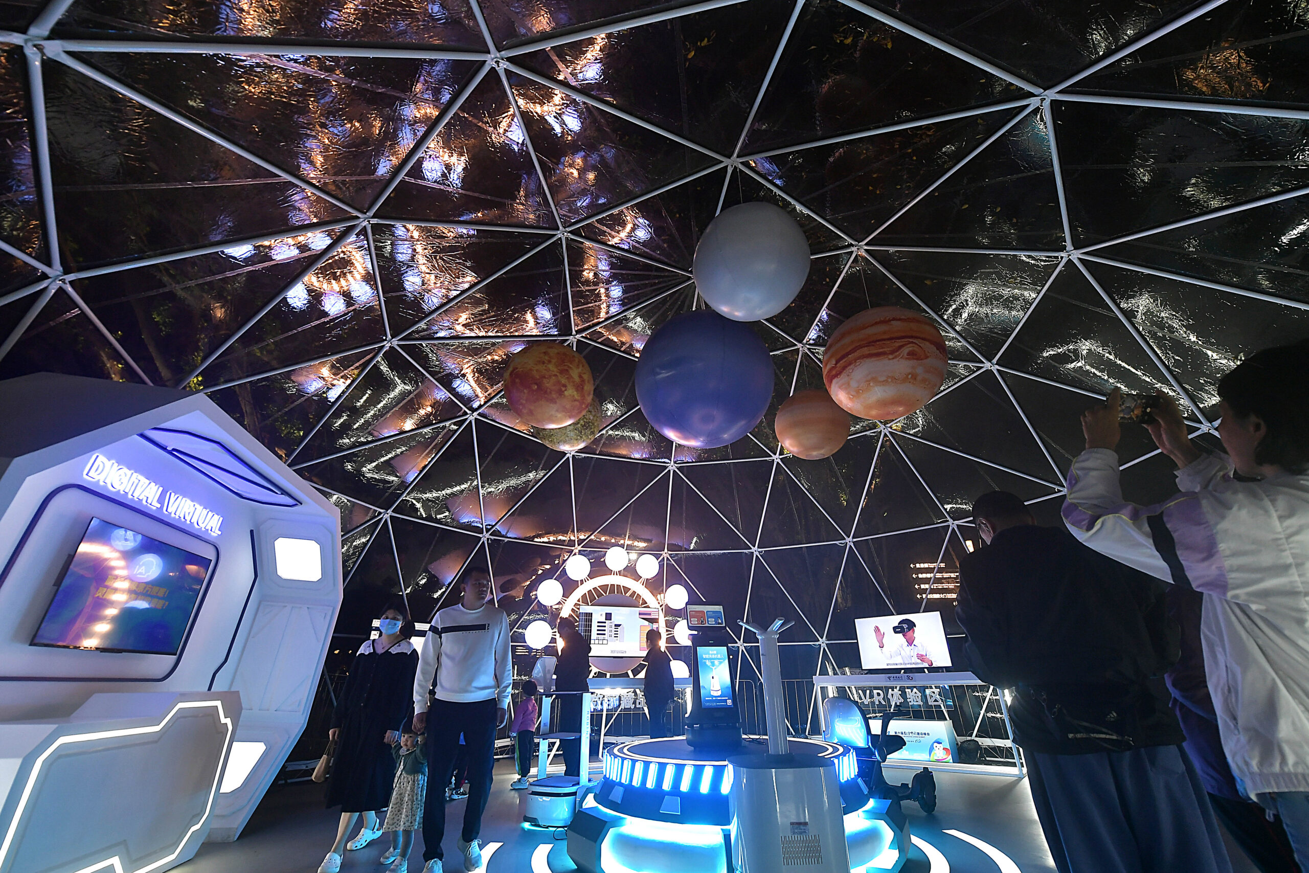 4月24日晚,福建福州,市民在元宇宙沉浸式体验馆参观。第六届数字中国建设峰会将在福州举行,为了让市民切身感受到科技的魅力,当日,福州西湖公园数字化应用场景正式亮相,吸引民众前来参观体验。