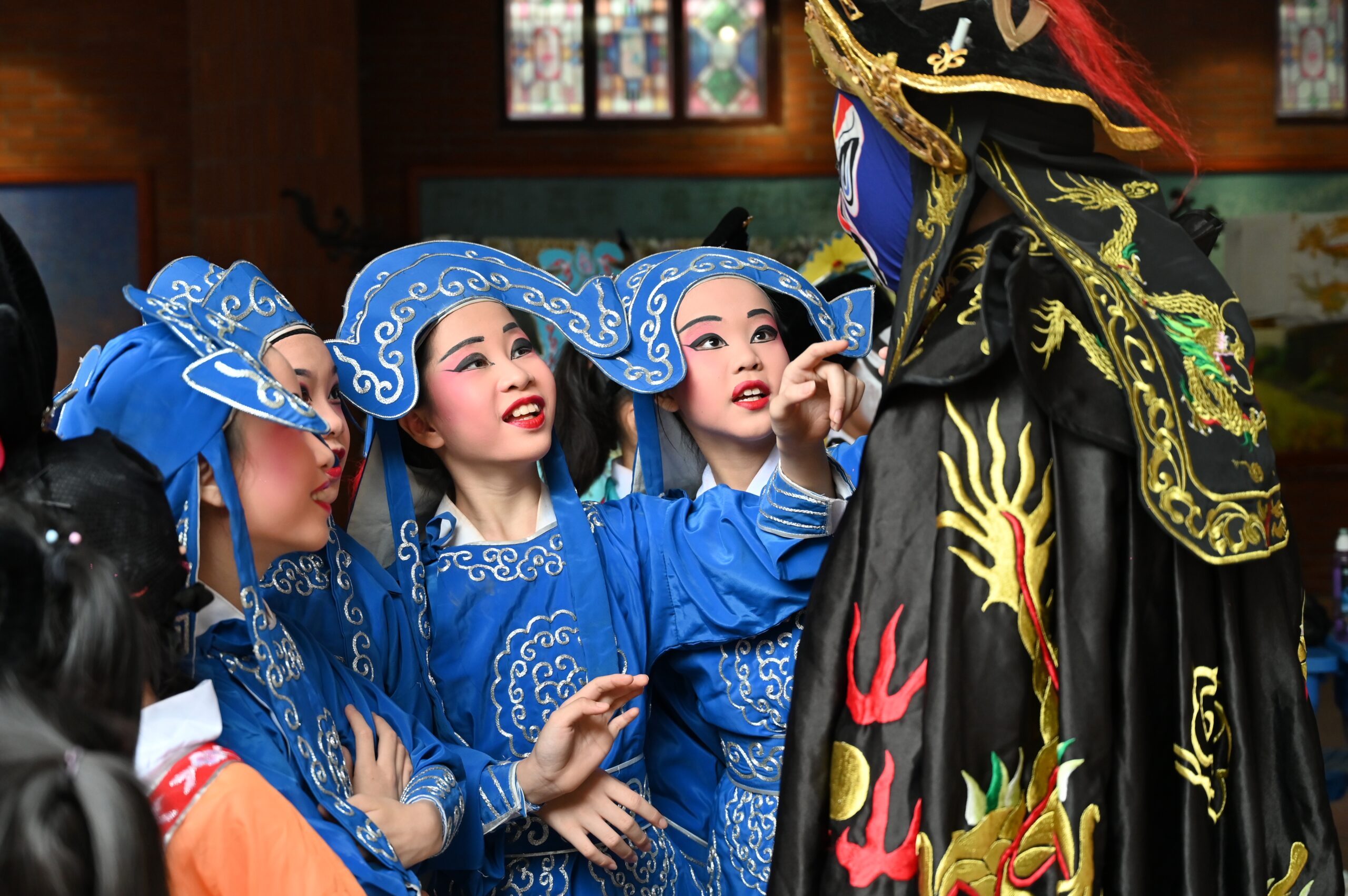 4月25日,广州市荔湾区,“红豆香飘荔湾”百场粤剧进校园研学体验活动启动仪式在詹天佑小学举办。此次研学活动将粤剧舞台搬进校园操场、课室讲台,学生可现场体验画大妆、穿戏服。图为穿着戏服的学生被表演者展示的脸谱吸引。