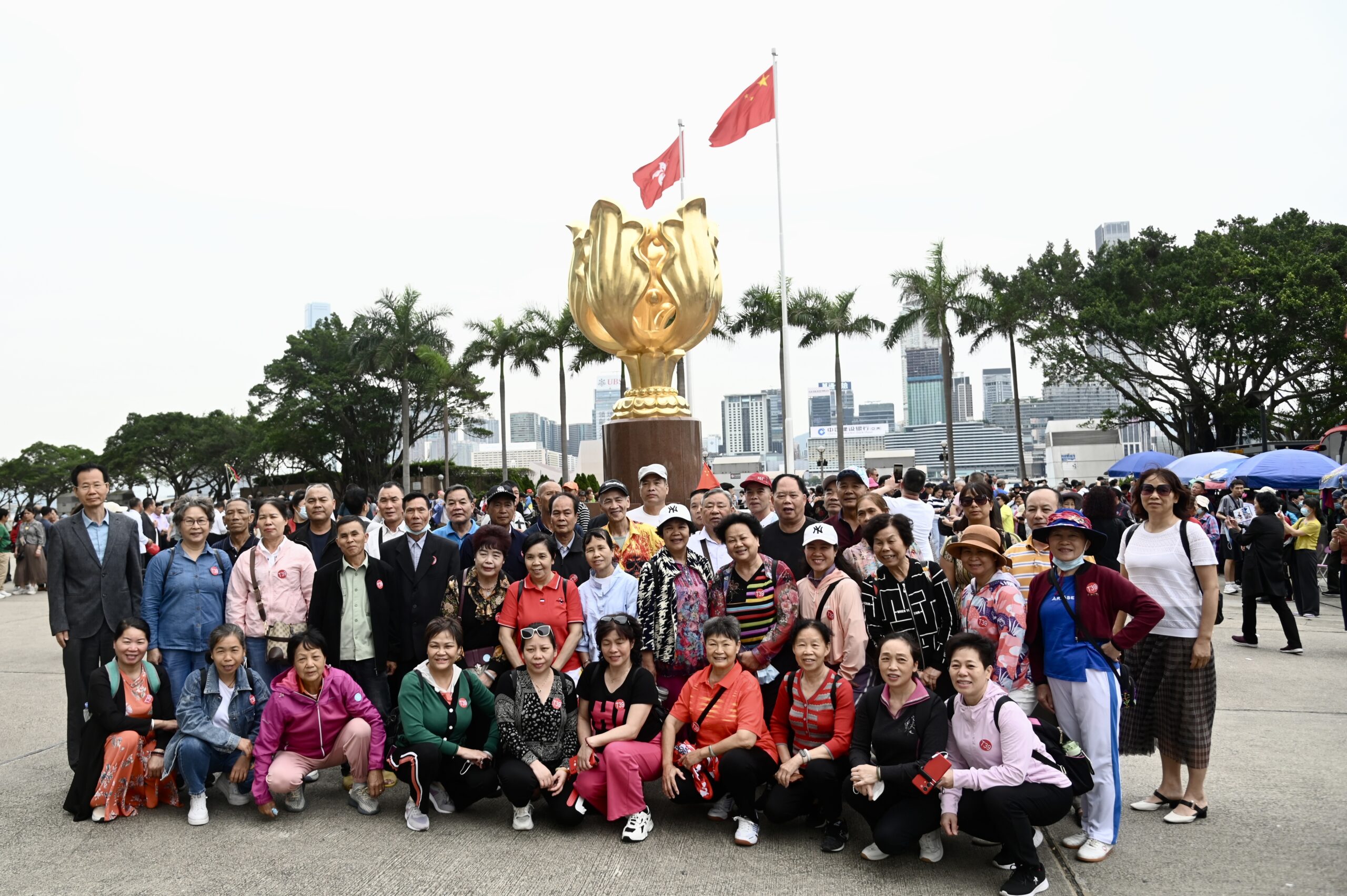 “五一”黄金周将至,4月26日,香港湾仔金紫荆广场吸引大批内地游客前来拍照。香港旅游业议会早前表示,“五一”长假期间会有约60万旅客访港。图为内地旅游团于香港金紫荆广场合影。