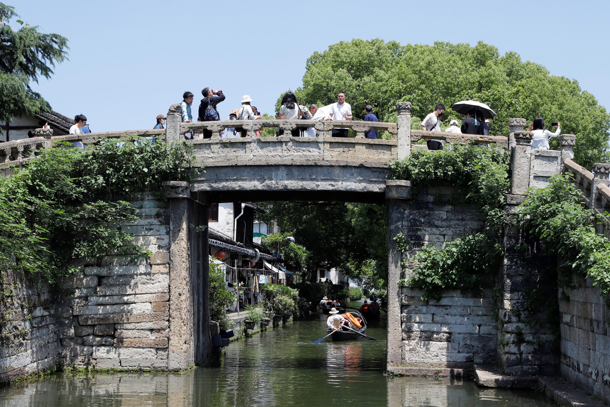 5月2日,浙江绍兴,游客在桥上走,乌篷船在水中行。作为中国首批24个历史文化名城,拥有2500多年建城史的绍兴是著名的水乡、桥乡。“五一”期间,来自各地的游客漫步古桥、乘坐乌篷船,享受悠闲的假日时光。