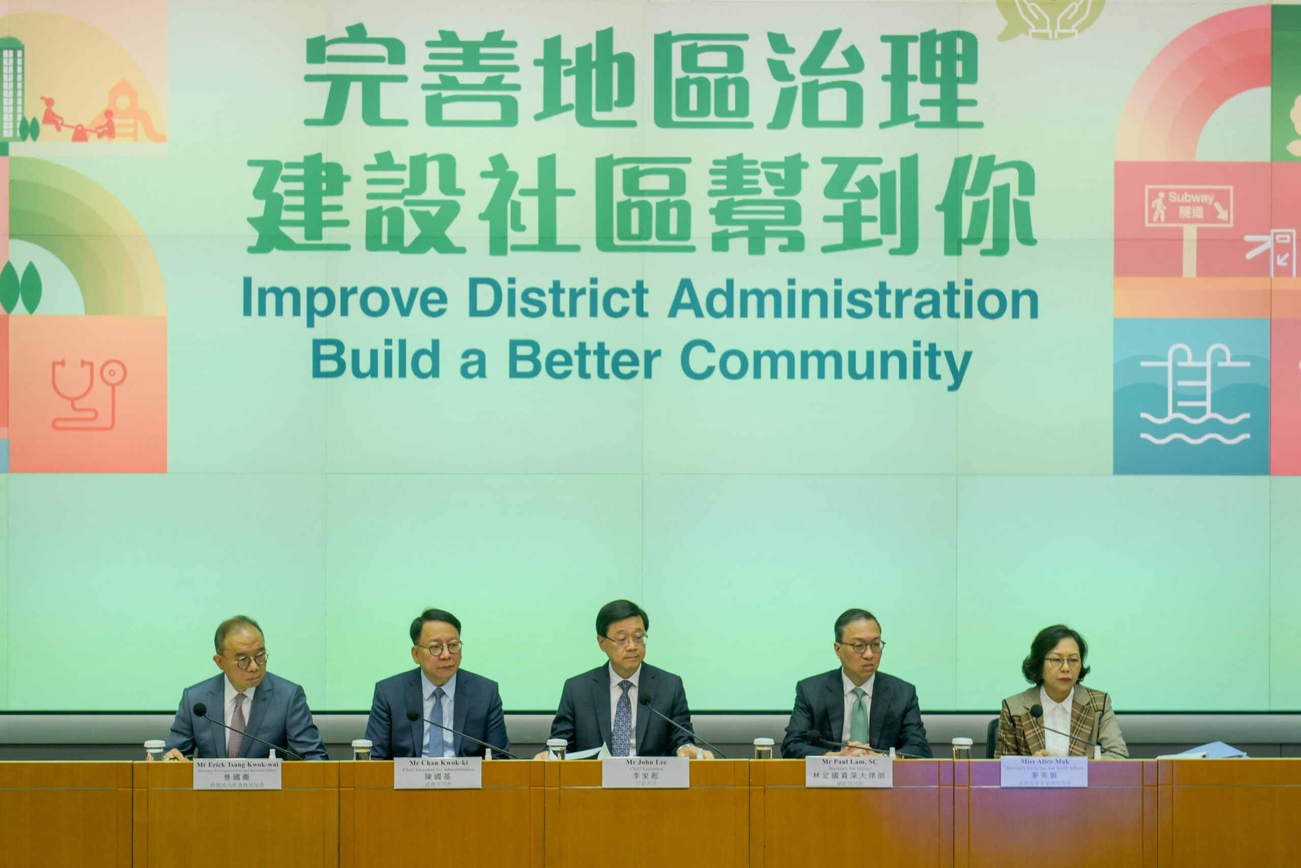 5月2日,香港特区行政长官李家超就完善地区治理建议方案举行记者会。第七届区议会的区议员总数为470名,包括委任议员、地区委员会界别选举产生的议员、区议会地方选区选举产生的议员,及27名当然议员。图为李家超(中)、香港特区政府政务司司长陈国基(左二)、香港特区政府律政司司长林定国(右二)、香港特区政府政制及内地事务局局长曾国卫(左一)、香港特区政府民政及青年事务局局长麦美娟出席记者会。