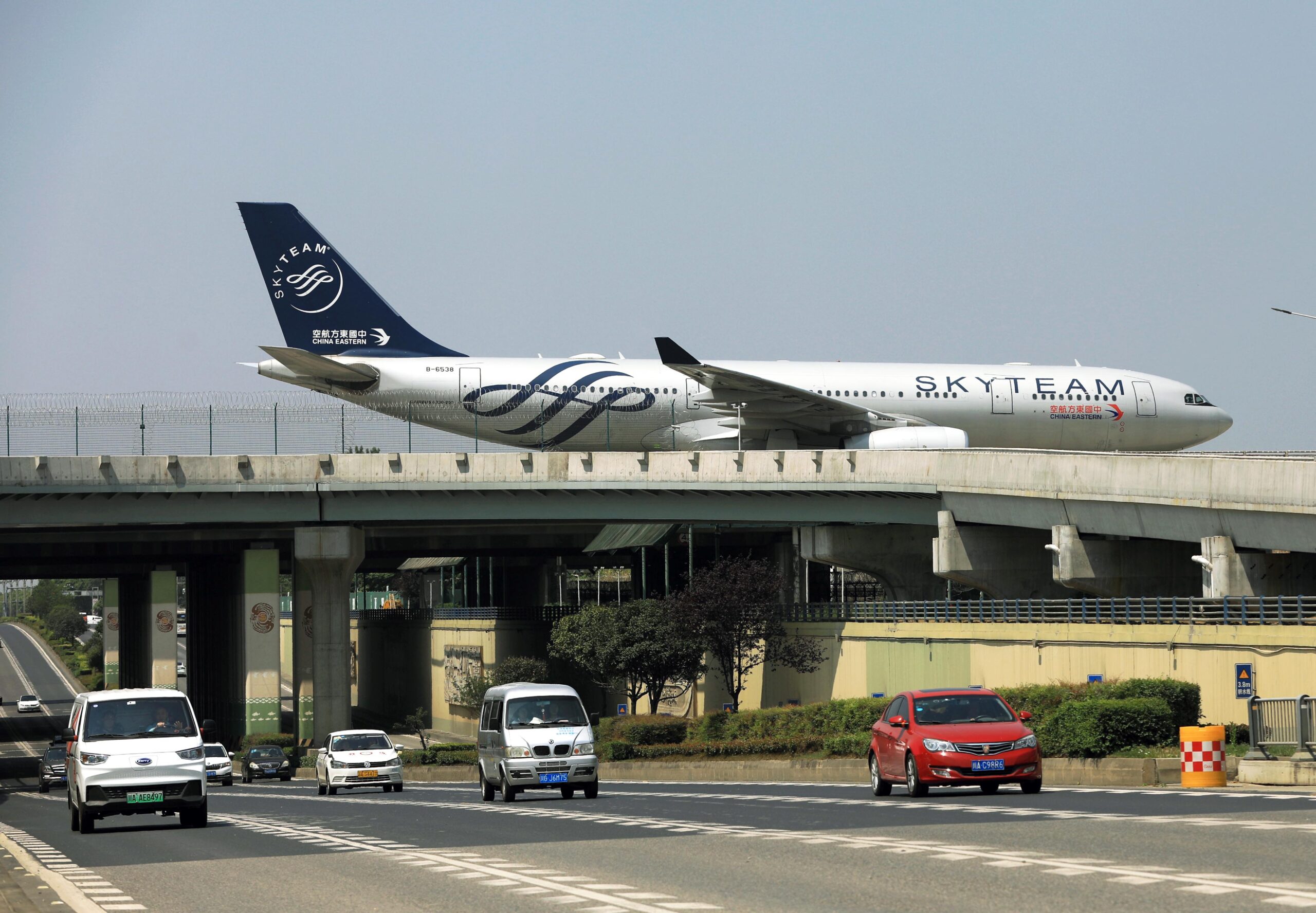 5月4日,成都市双流区大件路附近,一架飞机从公路上方“横穿”。据了解,飞机行驶的路面是双流机场飞机滑行道,下面是下穿公路,供汽车正常使用的道路和机场跑道纵横交错,从远处看飞机像在公路上跑一样。