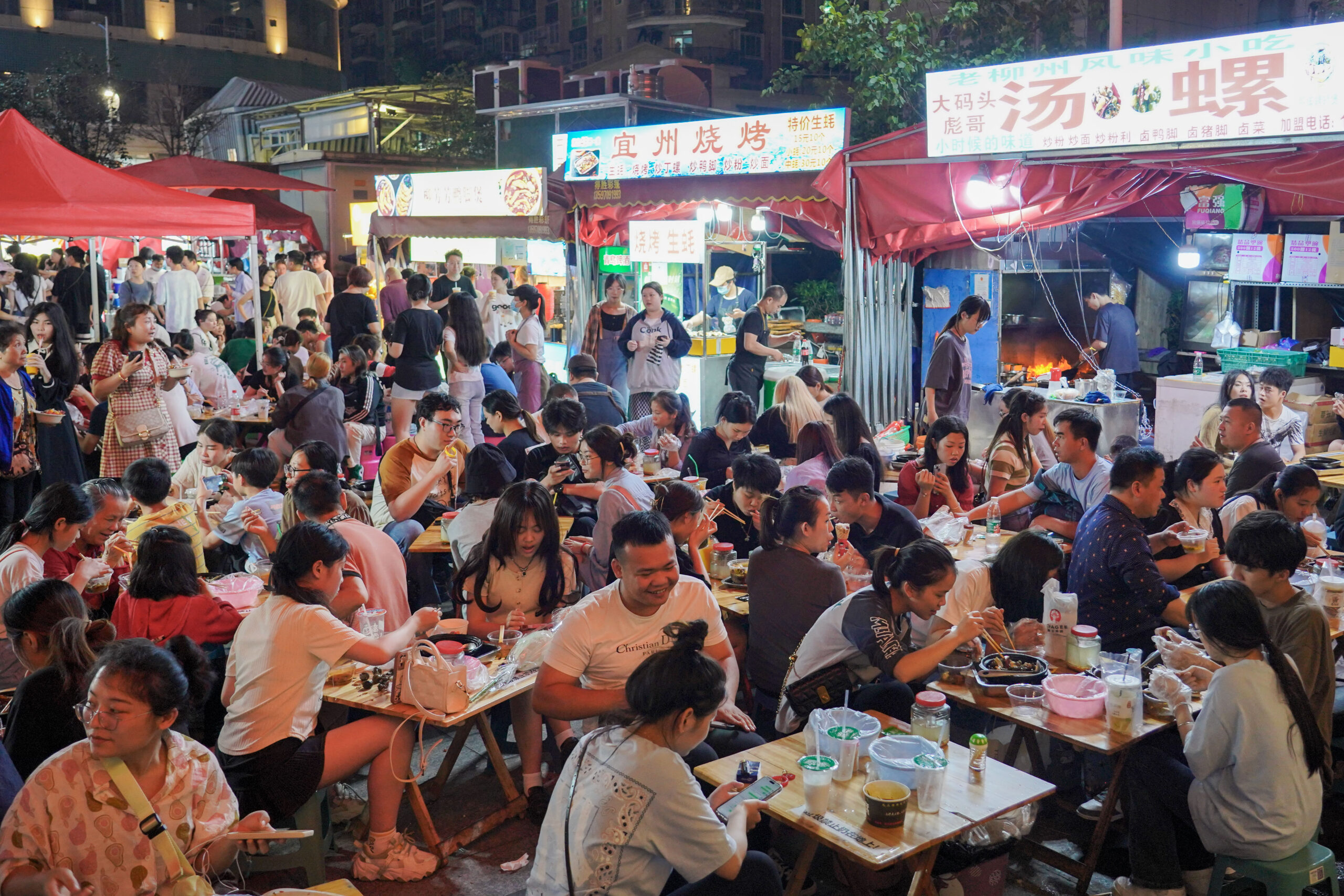 5月2日深夜,广西柳州市风情港便民夜市游人如织,灯火映亮整片街区。炒螺蛳粉、螺蛳鸭脚煲、炒冰等特色美食,吸引各地游客前来品尝。因螺蛳粉而“走红”互联网的柳州市,当地各大夜市成为游客们的热门“打卡”地。图为游客在柳州市风情港便民夜市品尝美食。