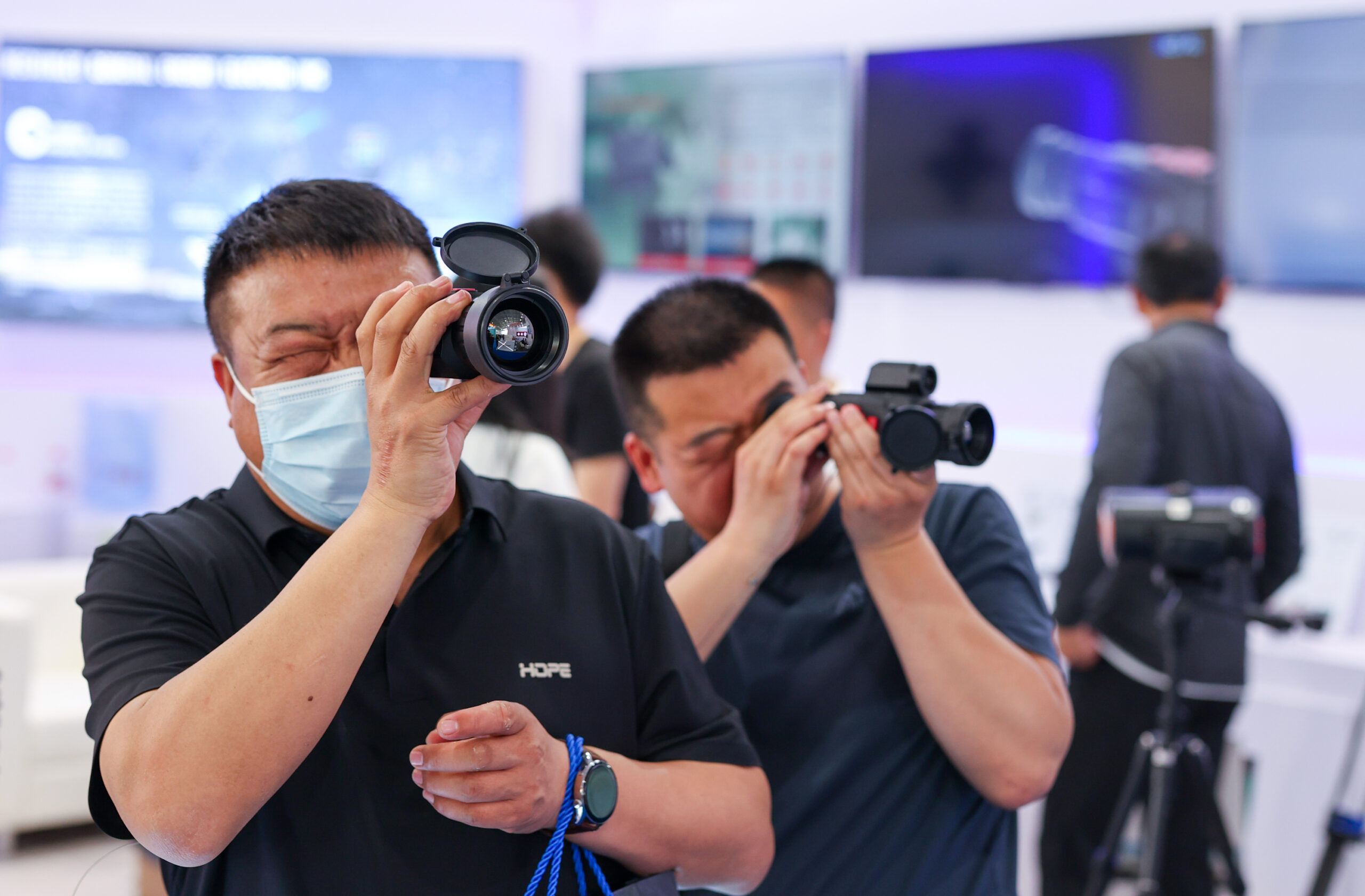 5月11日,第十一届中国国际警用装备博览会在北京首钢会展中心开幕。本届警博会为期4天,展览面积达5.34万平方米,分为公安机关装备馆、国际企业馆、国内企业馆和创新技术产品发布区,619家国内企业,40家境外企业参展。图为观众体验警用望远镜。