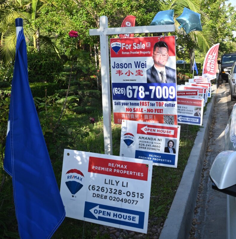 城市新闻5月12日阿卡迪亚报导,下午,加州阳光普照,阿卡迪亚325 W Las Flores Ave豪宅像过节一样热闹,这里正在举行「韦小宝地产嘉年华」,宁静小马路两旁停满了私家车。豪宅大门口外一排彩色广告旗迎风招展,地产「韦家军」的广告牌一个接一个,声势浩大。