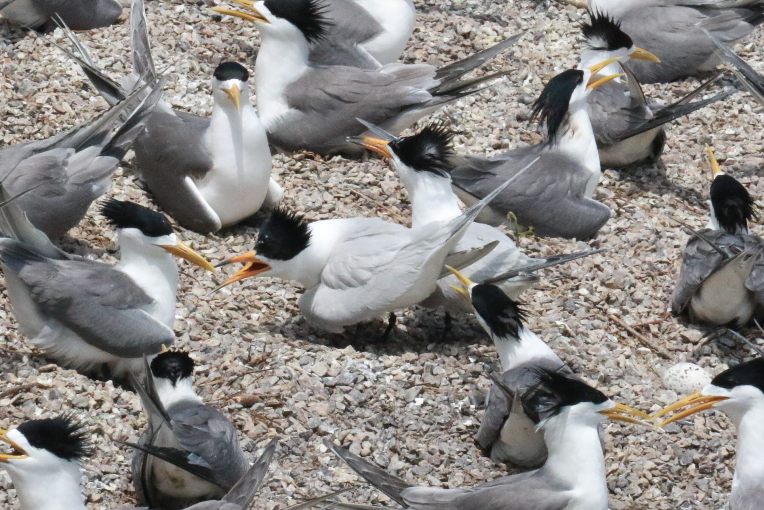 5月25日,数千只大凤头燕鸥和数十只中华凤头燕鸥在鸟岛栖息,画面中心两只羽毛颜色稍浅的即中华凤头燕鸥。2000年被重新发现的中华凤头燕鸥是极度濒危物种,被称为“神话之鸟”。浙江象山韭山列岛中的鸟岛是其在全球最大、最重要的繁殖地。经过十多年招引保护,近两年,在该岛监测到的中华凤头燕鸥成鸟最高数量都达到90只以上。