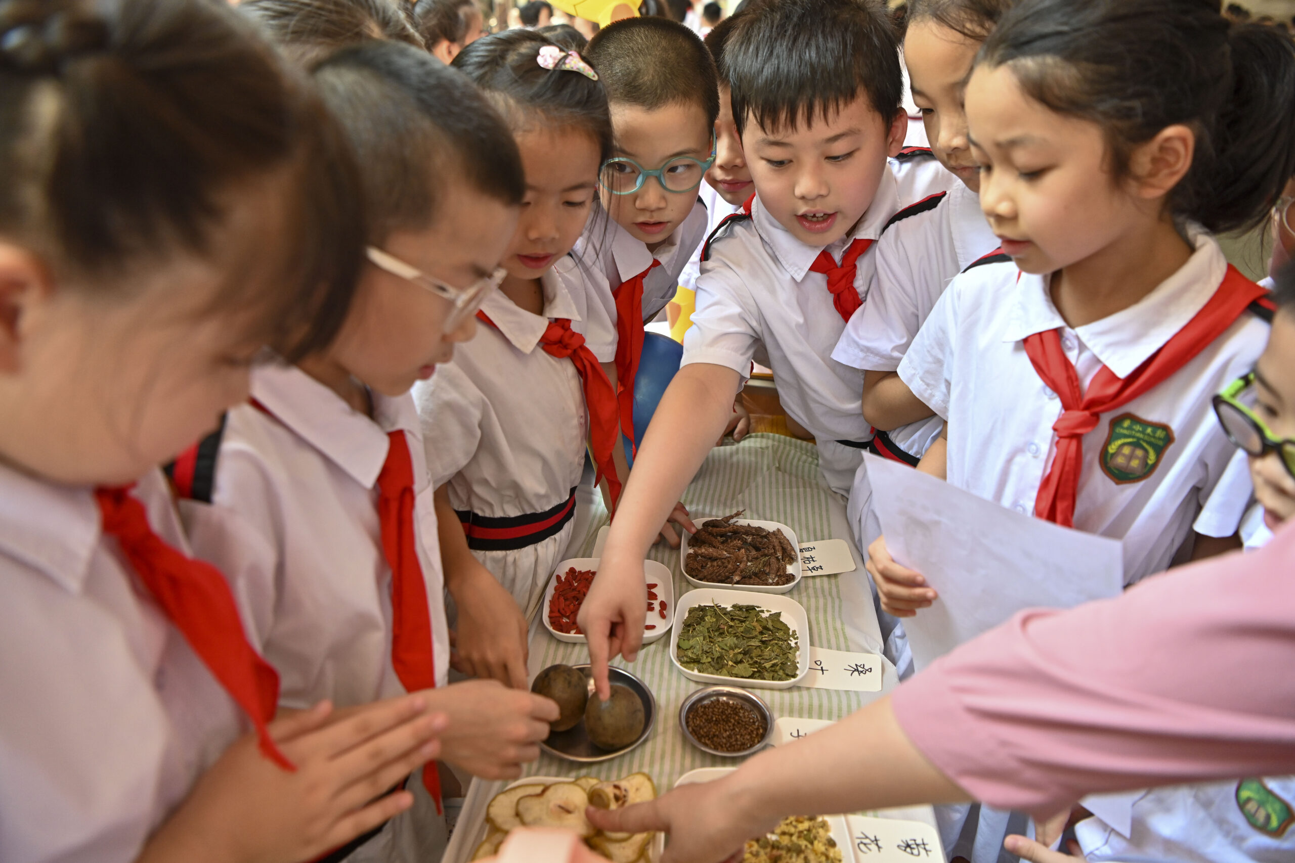 5月31日,广东省广州市,小学生在校园内观察中药原材料。当日,广东省中医院中医药文化进校园活动在广州朝天小学内举行。活动通过中药材科普游戏、中药膏方制作体验等环节,让学生近距离感受中医药文化。