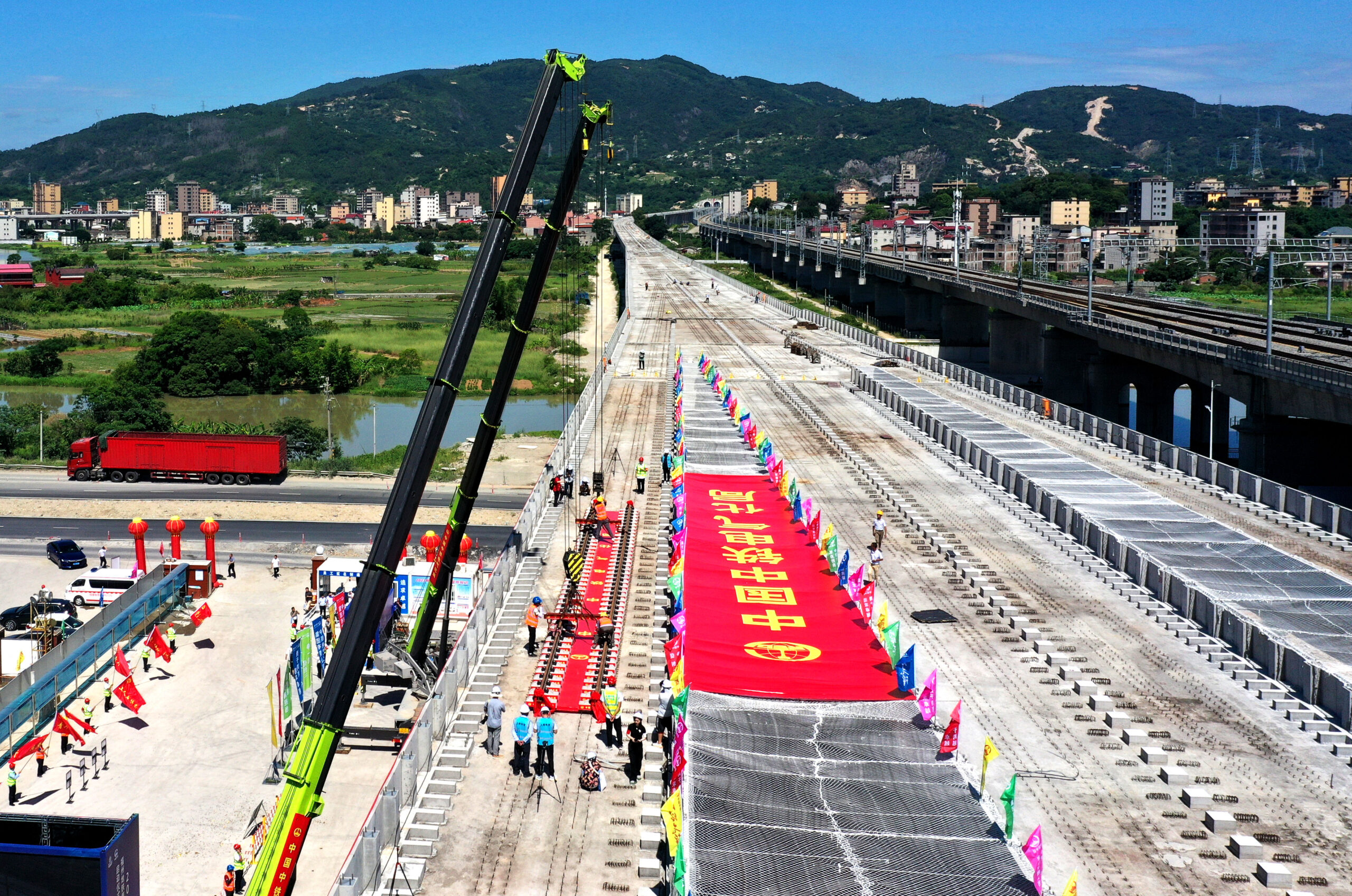 6月1日,福建福州,随着首节25米轨排铺设在首占西高架上,福州滨海快线正式进入轨道施工阶段。滨海快线(F1线)是连接福州主城区与长乐滨海新城以及福州长乐机场的快速轨道交通线,全长约62.4公里,设计时速为140公里/每小时。图为施工现场。