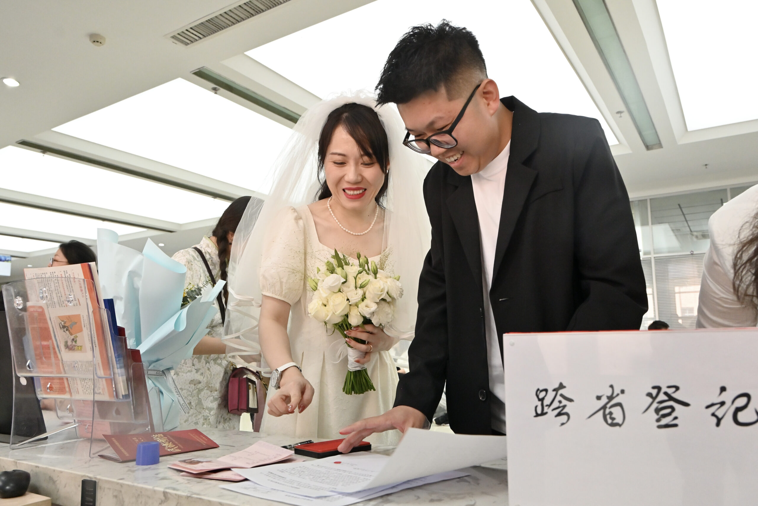 6月1日,内蒙古呼和浩特市赛罕区民政局婚姻登记处,一对新人在跨省登记窗口登记结婚。当日起,北京、天津、河北、内蒙古、辽宁、上海、江苏、浙江、安徽、福建、江西、山东、河南、湖北、广东、广西、海南、重庆、四川、陕西、宁夏共21个省(区、市)实施内地居民结婚登记和离婚登记“跨省通办”试点。
