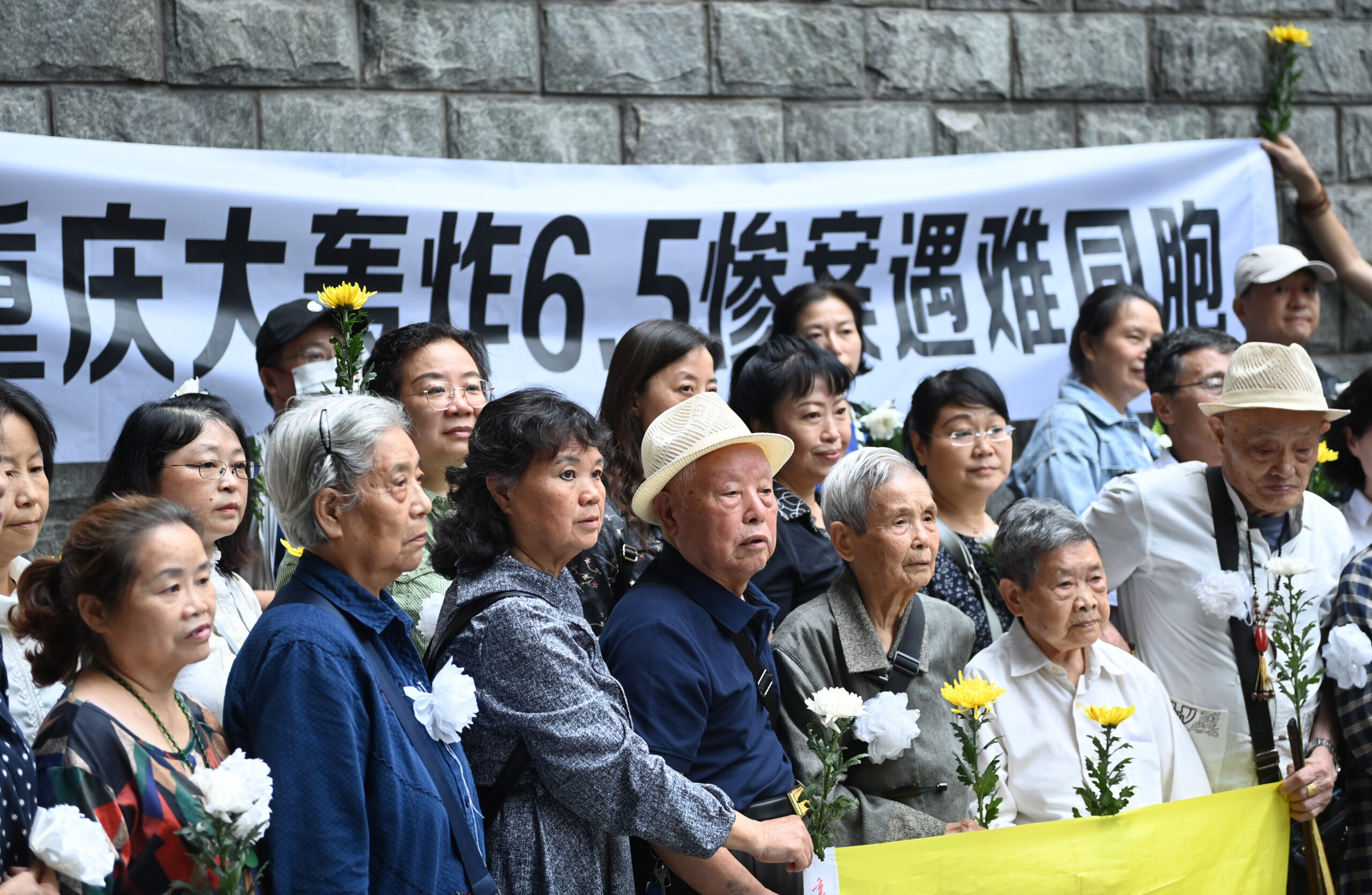 6月5日,重庆大轰炸幸存者及志愿者在重庆“六·五”隧道惨案旧址悼念遇难同胞。当日是重庆大轰炸“六·五”大隧道惨案纪念日,重庆全市拉响了防空警报,纪念在抗日战争期间于重庆大轰炸中不幸遇难的同胞。