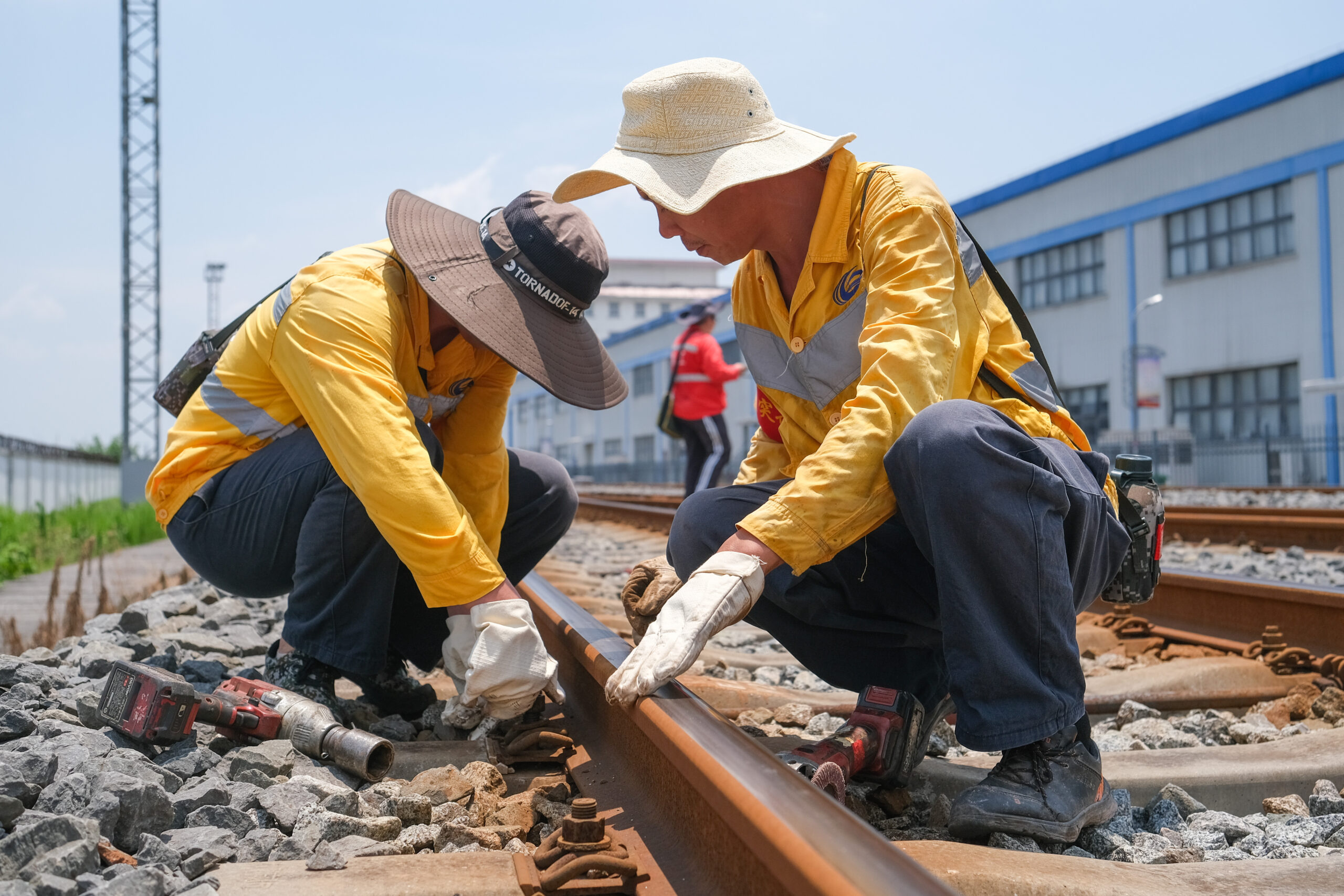 7月12日,中国铁路成都局集团有限公司重庆工务段重庆西线路车间梨树湾检查工区职工,在一天中最为炎热的时候,抢抓列车停运“天窗期”,开展线路设备巡检,避免轨道高温胀轨风险,为铁路安全保驾护航。图为重庆西线路车间梨树湾检查工区,工人更换钢轨螺栓。