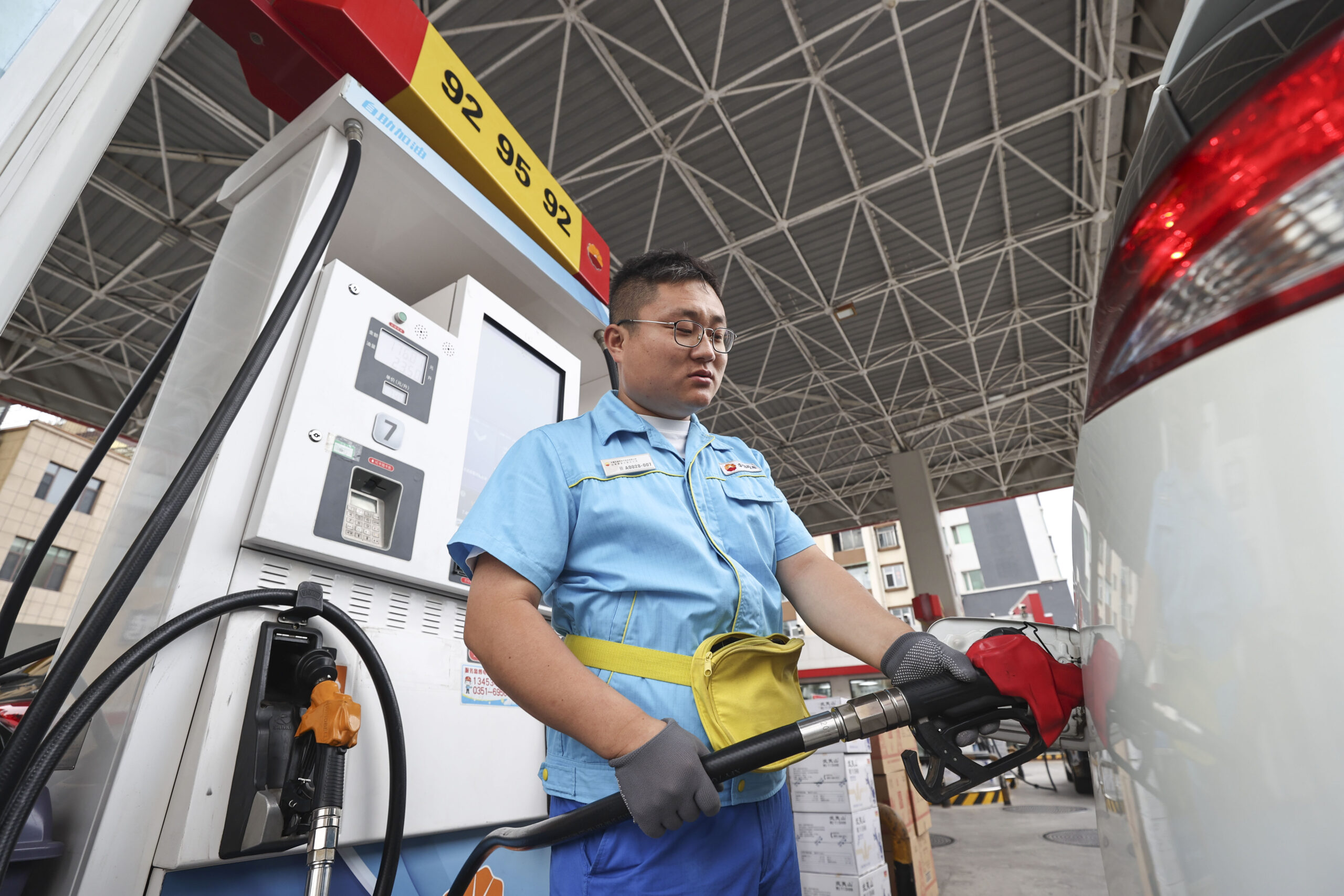7月12日,山西太原,工作人员在给车辆加油。当日,中国国家发展和改革委员会发布消息,根据近期国际市场油价变化情况,按照现行成品油价格形成机制,自2023年7月12日24时起,国内汽、柴油价格每吨分别提高155元人民币、150元人民币。继6月底的小幅上涨后,中国国内油价继续上调。