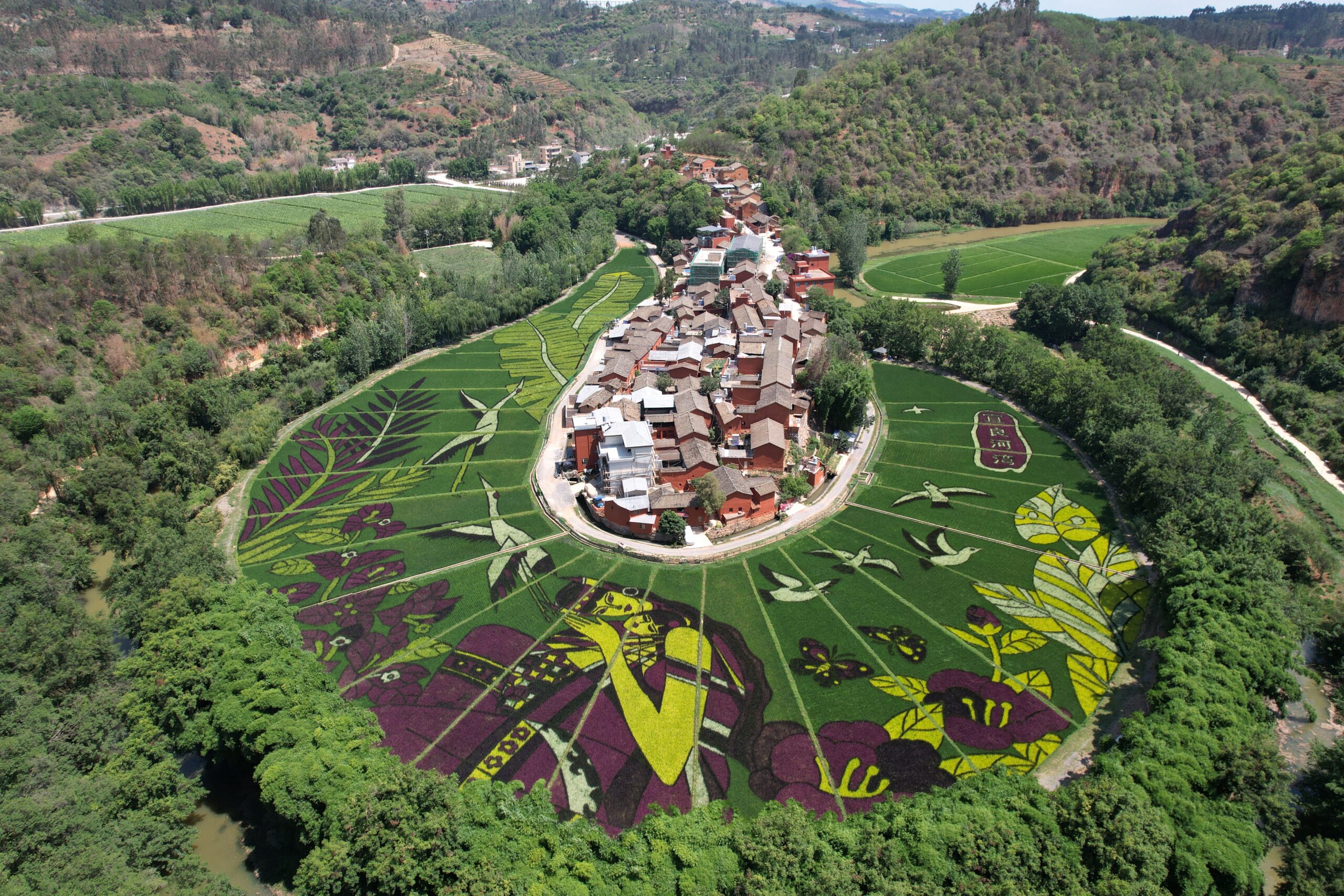 7月17日,航拍巨型稻田画。近日,云南省昆明市宜良县河湾村和马蹄湾景区种植的巨型彩色稻田画迎来最佳观赏期。
