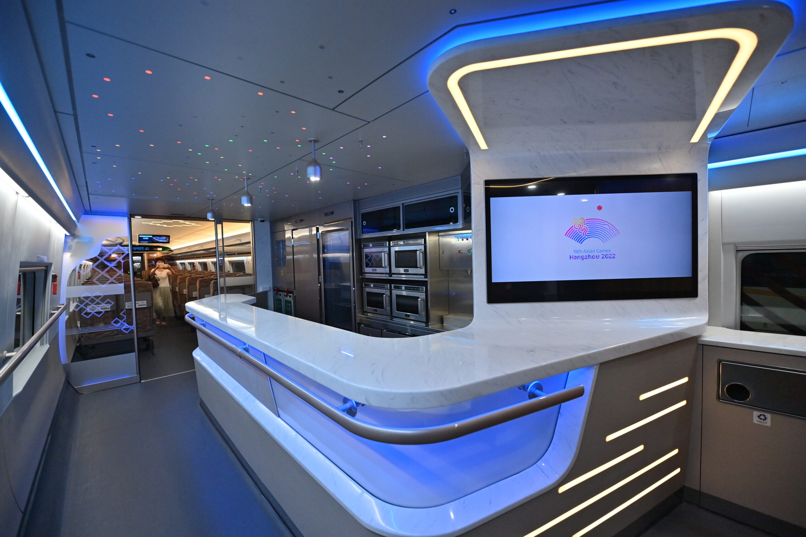 7月21日,专为杭州第19届亚运会打造的复兴号亚运智能动车组在吉林长春正式下线。该列车设计时速350公里,定员578人。图为动车组餐车。 未经允许不得转载:城市新闻网icitynews » 复兴号亚运智能动车组在长春下线