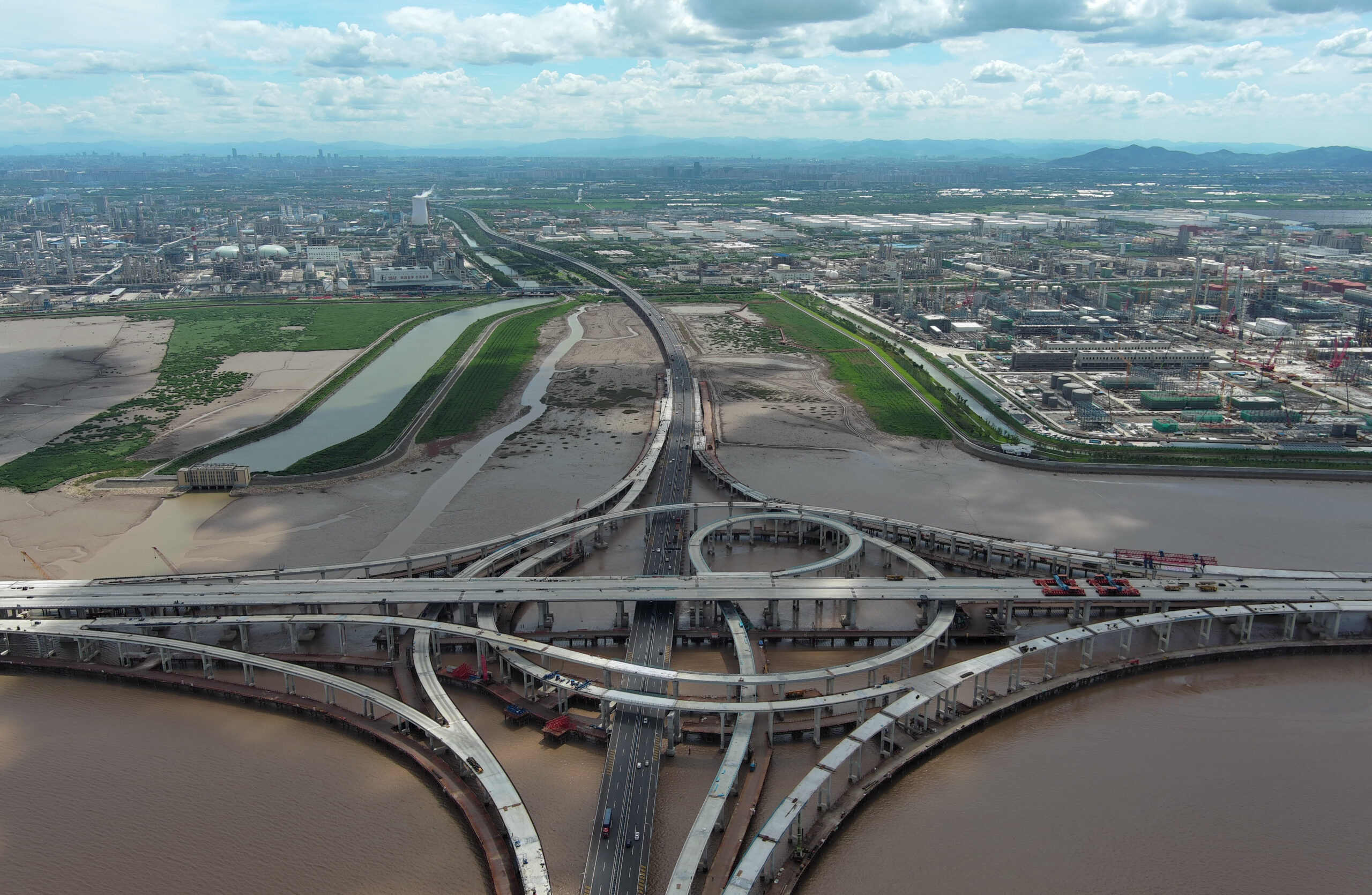 7月25日,滨海互通。当日,亚洲最大海上互通——位于浙江宁波杭甬复线宁波一期项目滨海互通完成全部架梁任务,基本成型。滨海互通作为该项目与甬舟高速公路连接的海上互通立交桥,设计占用海域613亩,设1座主线桥、8座匝道桥、4座拼宽桥,整体呈苜蓿叶造型。